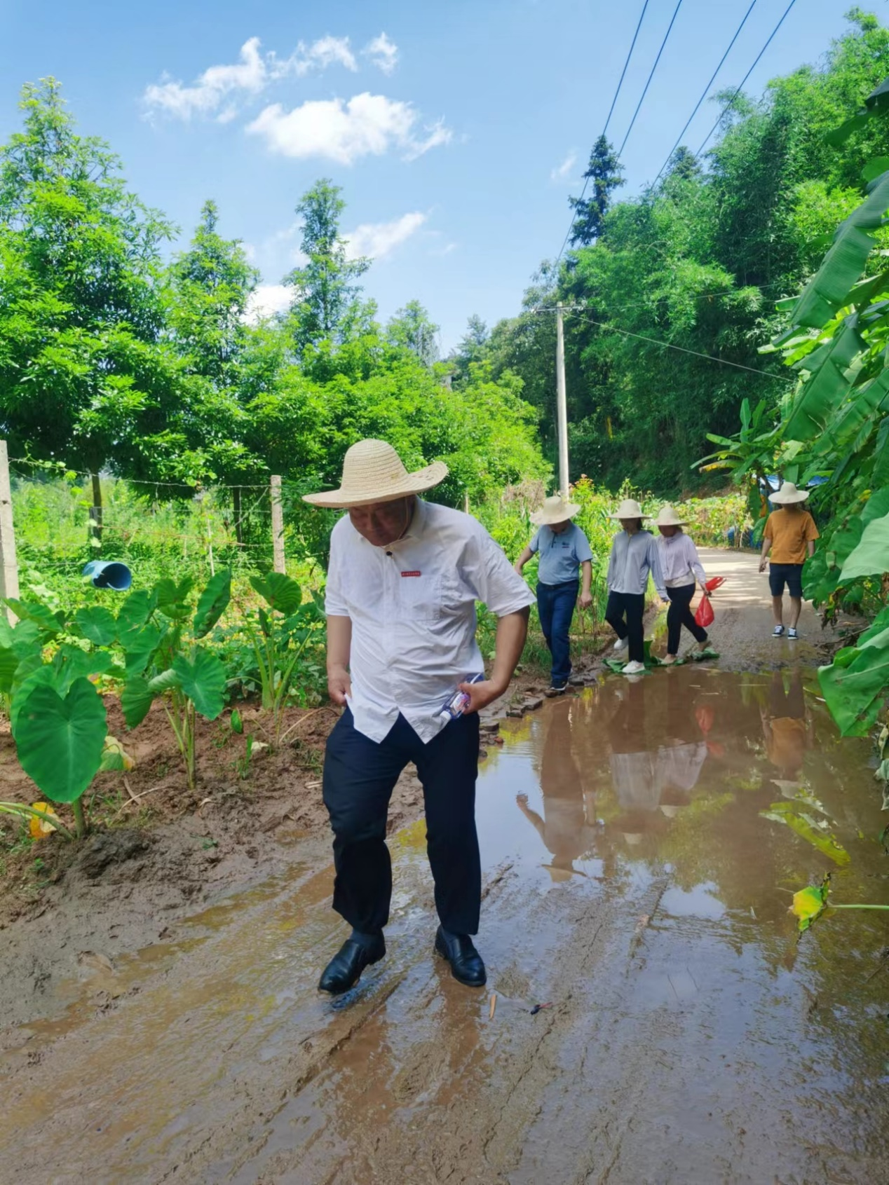 2022年6月23日,学院党委书记谢友平带领设计系和管理系党总支书记傅晋飞、设计系和管理系第一党支部书记赖莉琼、副书记庄梅华,到夏道镇夏道村围绕东田五十亩高标准农田设计规划事项开展调研座谈并进行田野调查。