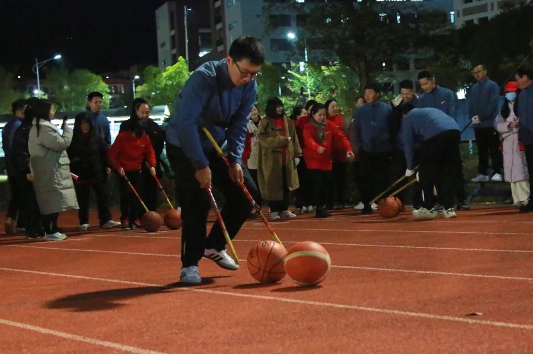 “赶‘猪’接力赛跑”——手持长杆,以最快的速度将篮球赶至终点,并巧妙地绕过障碍物,小“猪”跑得灵活,参赛教师们的应对更灵活,大家各展奇招、同心协力完成比赛。