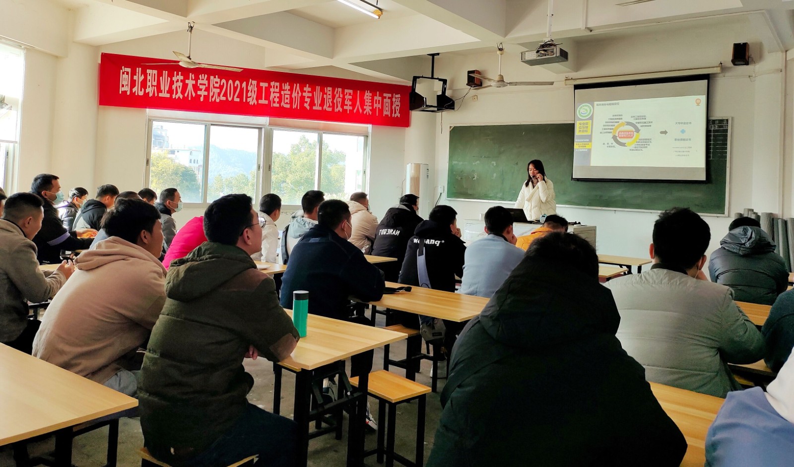 11月26日,在南平市建阳网际学校举行2021年退役军人新生入学仪式。51名被闽北职业技术学院管理系工程造价专业录取的退役军人新生进入校园求学,完成从军人到学生的华丽转身。学院副院长郑需勇、南平市退役军人事务局安置就业科科长李世芳、院教务处处长范民、院管理系系主任陈婷、招生与继续教育处副处长詹永珍、网际学校校长张曲斌等出席开学仪式,开学仪式由建阳网际学校校长张曲斌主持。