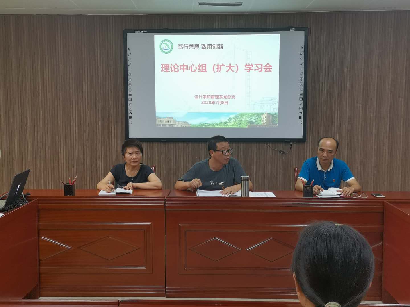7月8日下午,设计系和管理系党总支在行政楼607室召开理论中心组(扩大)学习研讨会。系党政领导、总支委员、支部委员、部门负责人等参加了会议。