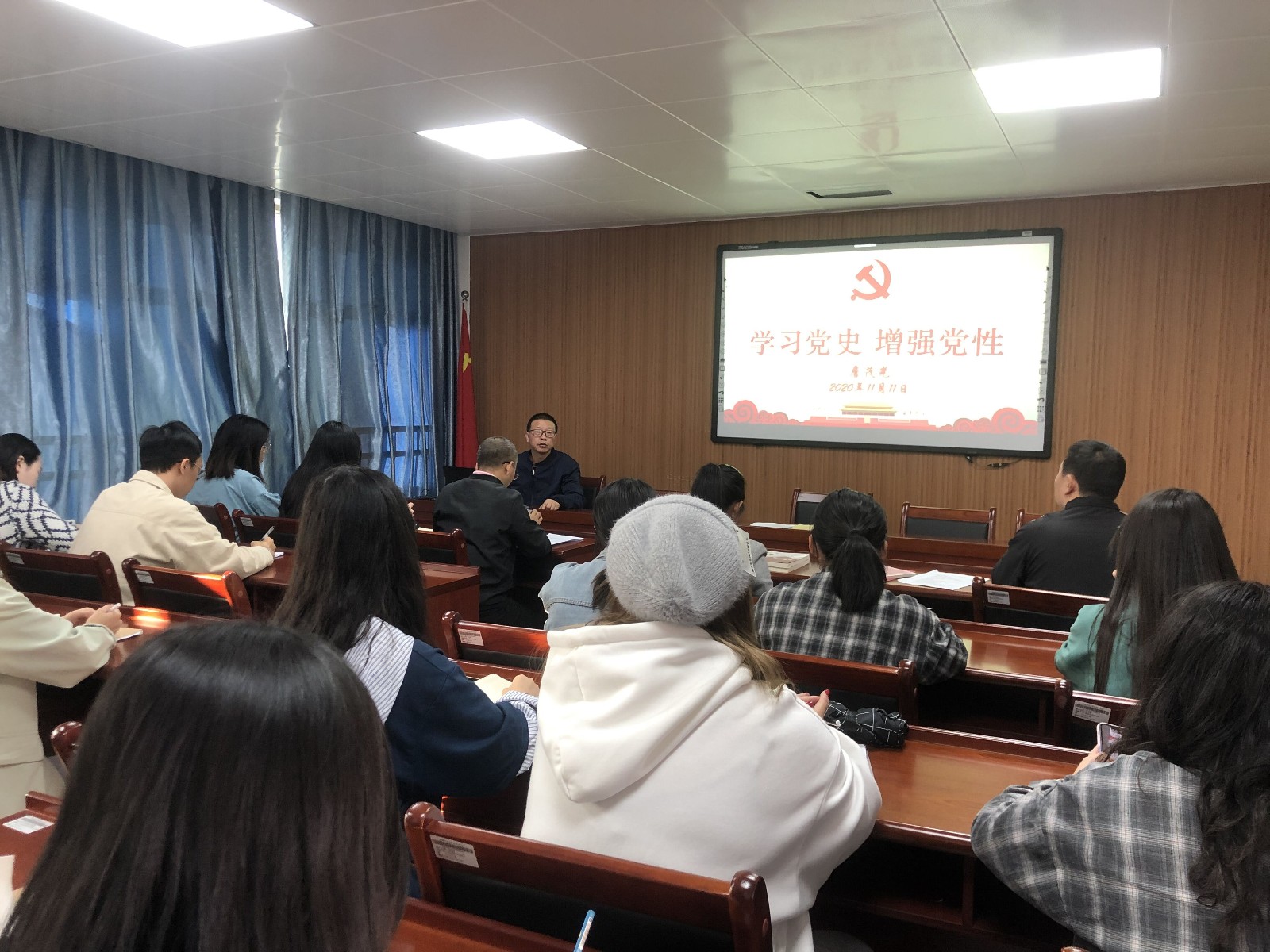 11月11日,设计系和管理系联合党总支举办学习活动,总支詹茂光书记做《学习党史,增强党性》专题党课,总支党员、入党积极分子代表共同参加。
