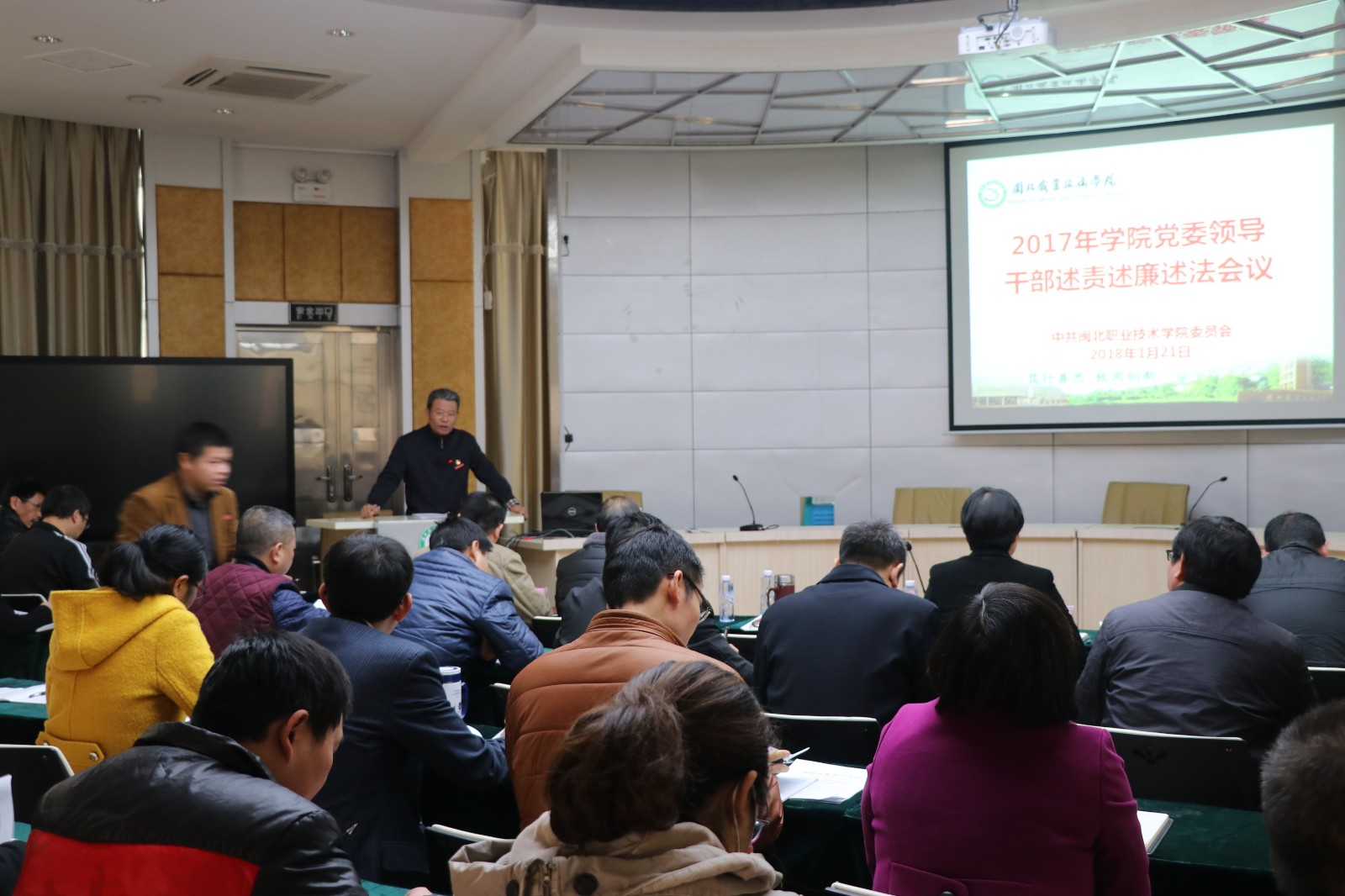 1月20日上午,学院2017年度党委领导班子述责述廉述法会议在行政楼一楼学术报告厅召开。学院中层及以上干部、人大代表、政协委员、民主党派成员代表共50人参加会议。院党委书记高建富同志、副书记陶金辉同志、党委委员、副院长陈良壁同志、纪委书记姚荣同志分别围绕述责述廉内容:重点是执行政治纪律和政治规矩、履行管党治党责任、推进党风廉政建设和反腐败工作,以及执行廉洁纪律情况进行。主要领导高建富书记还围绕述法内容:重点是尊法、学法、守法、用法、普法五个方面,突出报告履行推进法治建设第一责任人职责,落实“谁执法谁普法”责任制情况;依法决策、依法行政情况进行。