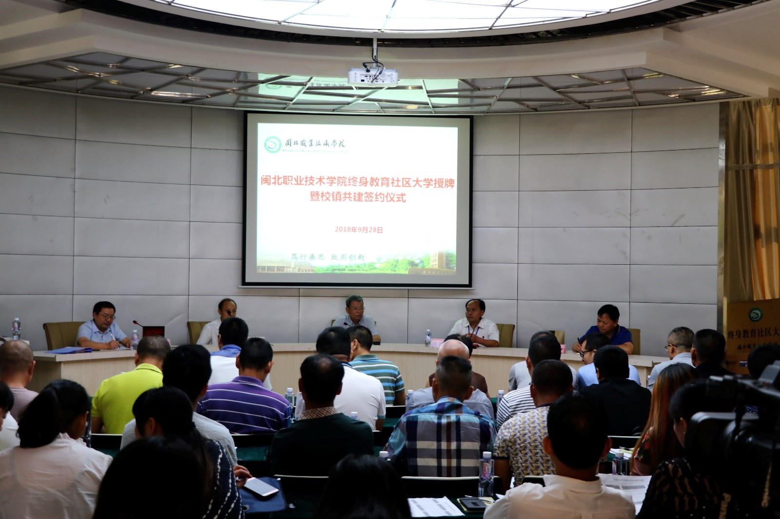 2018年9月28日上午,Beat365中文官方网站在学院行政楼报告厅举行终身教育社会大学授牌暨校镇共建签约仪式。学院党委书记高建富同志、副书记陶金辉同志,夏道镇党委书记张崇发同志、镇长李金文同志以及夏道党政班子成员,下派书记、党群工作者、各村(居)书记、主任、村(居)委员和学院有关部门负责人100余人出席活动,共同见证校镇合作新篇章的开启。