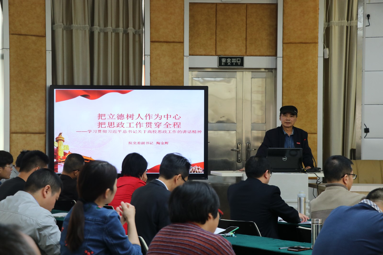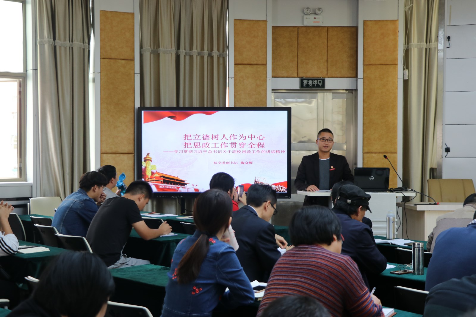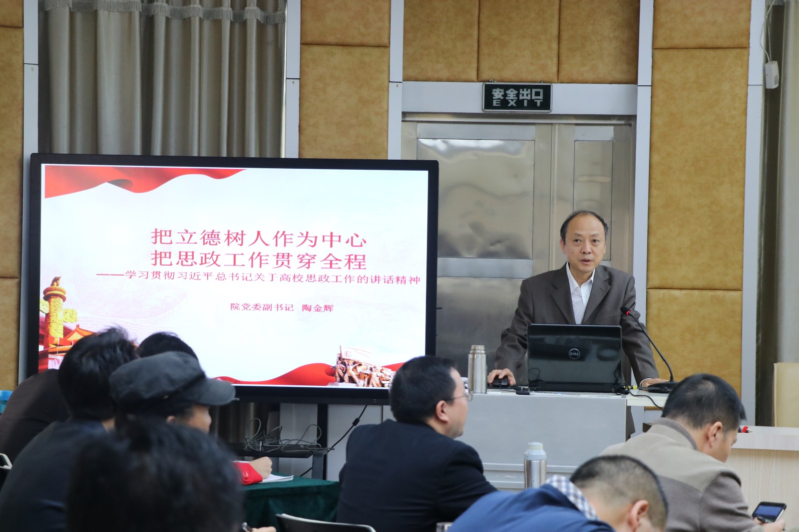 集中学习研讨会议上,学院党委副书记陶金辉同志作题为《把立德树人作为中心,把思政工作贯穿全程》的主旨发言。重点从以下三个方面进行阐述:一是对习近平总书记在全国教育大会上谈高校思政的重要讲话进行了集中学习;二是从基本原则、主要内容、保障措施三个不同的角度分别分析了如何贯彻习近平总书记关于思政工作的重要系列讲话精神,实施高校思政工作质量提升工程的内容;三是如何抓好高校思想政治工作“四大责任”的落实。