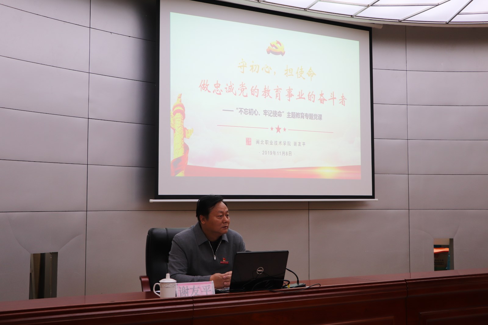 课上,谢友平同志为大家讲授了题为《守初心,担使命,做忠诚党的教育事业的奋斗者》的专题党课。他从学习习近平总书记关于“不忘初心 牢记使命”论述的感悟和体会谈起,剖析了学习贯彻习近平新时代中国特色社会主义思想取得的工作成果、差距及原因,阐述了运用习近平新时代中国特色社会主义思想指导实践、推动改进工作思路的方法。