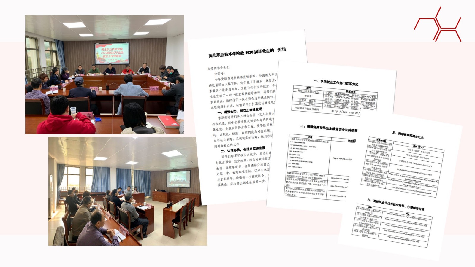 (一)促就业。创新方式、全员推动,切实提升就业指导质量。分专业搜集就业政策和招聘信息,精准投放,鼓励引导毕业生多渠道就业,实行一对一帮扶指导,“一生一策”和包保的方式,重点做好就业困难和湖北籍毕业生精准帮扶工作,启动多场次线上就业招聘。将500多家企业的招聘信息、100多场次的各类招聘会信息第一时间进行发布。