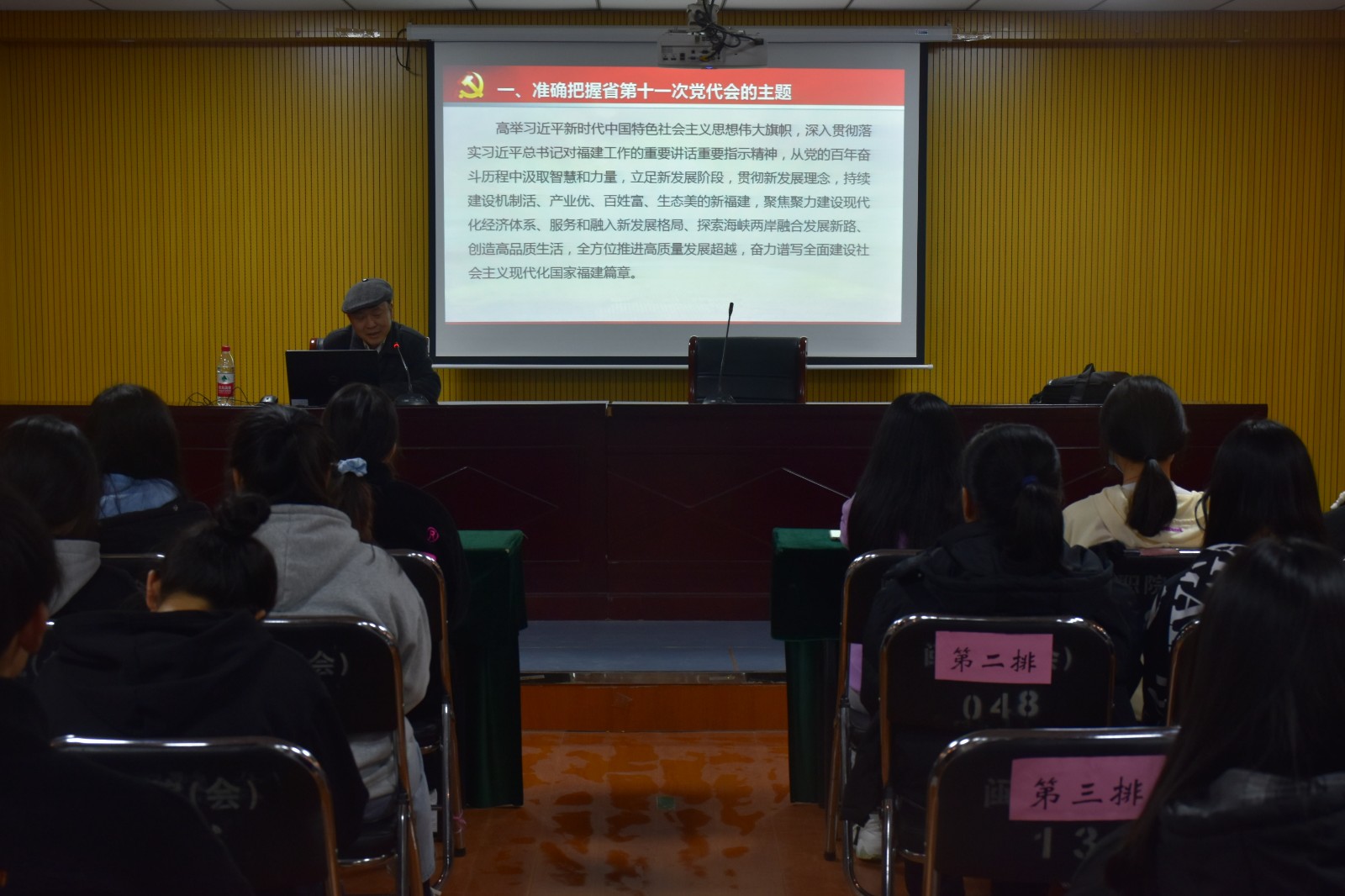 12月15日晚,学院党委副书记陶金辉在18号楼多功能厅,向教育系2021级学生代表宣讲省第十一次党代会精神。