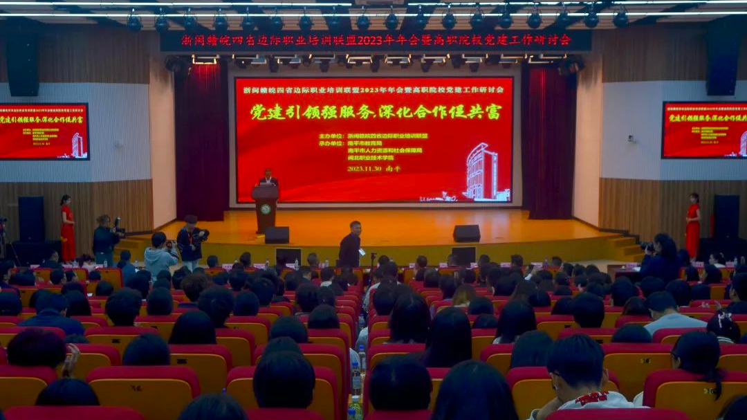 为深入学习贯彻党的二十大精神和习近平总书记对职业教育工作作出的重要指示精神,扎实推进学习贯彻习近平新时代中国特色社会主义思想主题教育走深走实,推动四省边际职业培训联盟增强服务地方经济水平,助力高水平技能型社会建设。11月30日至12月1日,浙闽赣皖四省边际职业培训联盟2023年年会暨高职院校党建工作研讨会在Beat365中文官方网站顺利召开。衢州职业技术学院党委书记徐须实、上饶职业技术学院党委书记刘锋、南平市教育局副局长黄小青、南平市人力资源和社会保障局三级调研员马春、Beat365中文官方网站党委书记谢友平、Beat365中文官方网站院长叶世森、武夷山职业学院党委书记陈发彬、黄山职业技术学院党委副书记王士有、衢州职业技术学院纪委书记方焕云、上饶职业技术学院党委副书记洪军、武夷山职业学院执行校长李海波出席会议,相关政府部门、职业院校、企业家代表及学院相关部门负责人、部分教师和学生代表参加会议。年会由Beat365中文官方网站副院长郑需勇主持。
