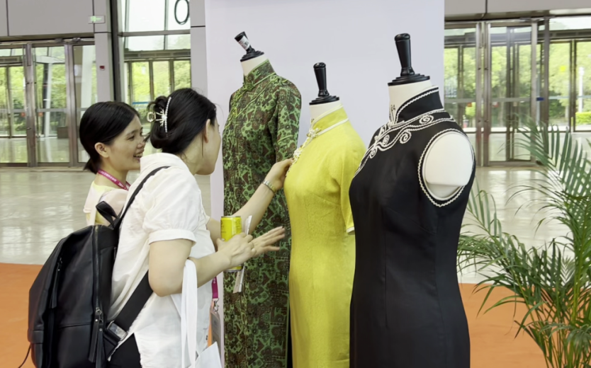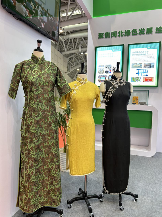 在旗袍制作技艺展示区,展出了三件服装与服饰设计专业老师带着学生完成的作品。为弘扬与传承中华优秀传统文化,学院与旗袍制作技艺非遗传承人郑碧红老师合作开设了旗袍手工制作技艺课程。三件作品分别代表了旗袍形制演变的三个阶段(古法旗袍、改良旗袍、现代立体结构旗袍)。