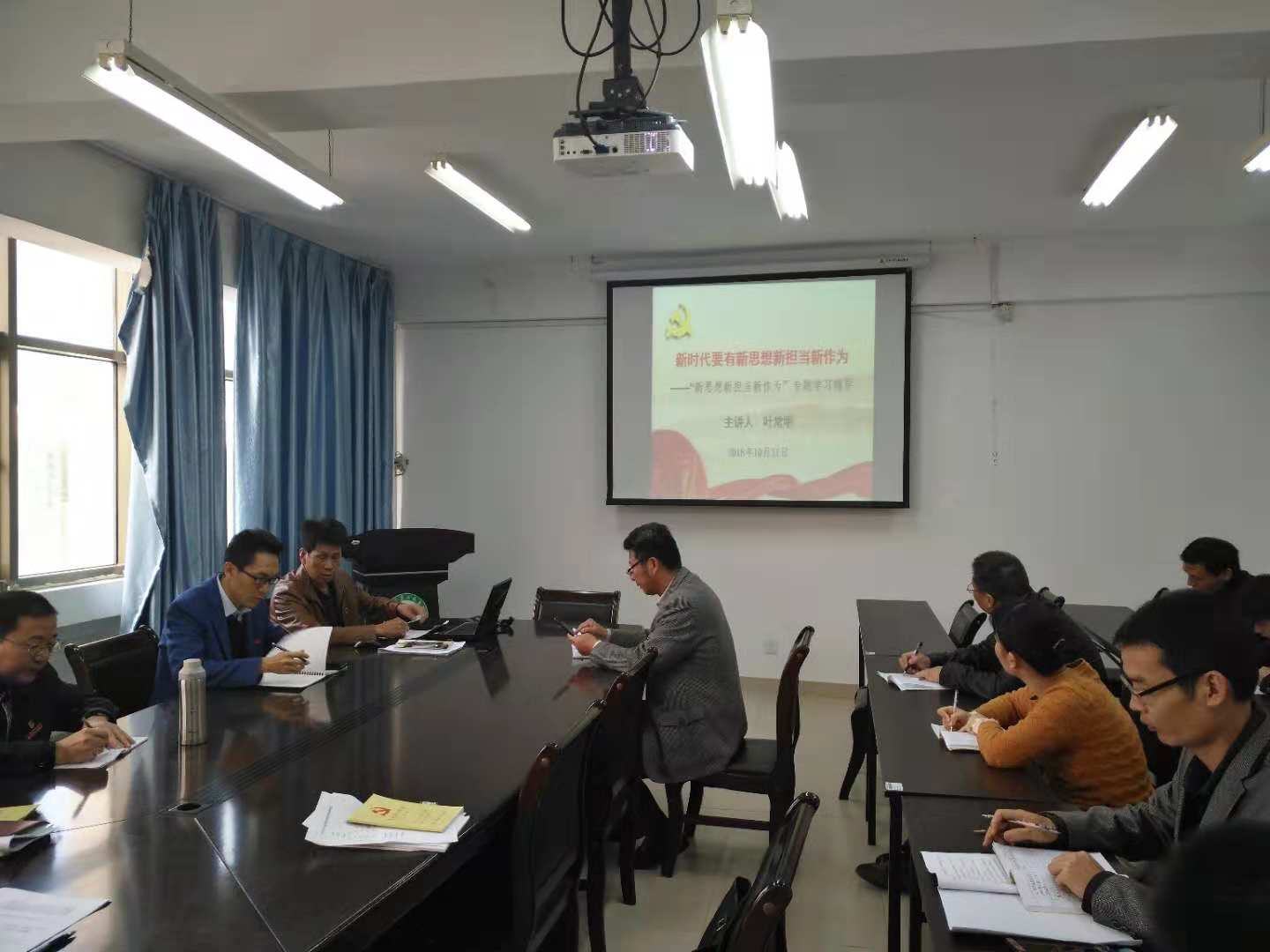 2018年10月31日上午,学院机关党总支在行政楼五楼会议室召开“新思想、新担当、新作为”专题党课学习会。学院机关党总支叶常明书记作“新思想、新担当、新作为”专题党课学习辅导,通过专题党课学习,使机关全体党员充分认识了“新思想、新担当、新作为”的精神实质和丰富内涵,与会党员表示要以习近平新时代中国特色社会主义思想武装头脑、指导实践,要切实增强“四力”,大力弘扬“四种精神”,听党话跟党走。机关党总支还对“新思想、新担当、新作为”专题后续阶段交流讨论工作作出部署。