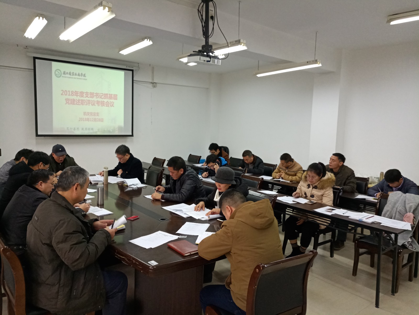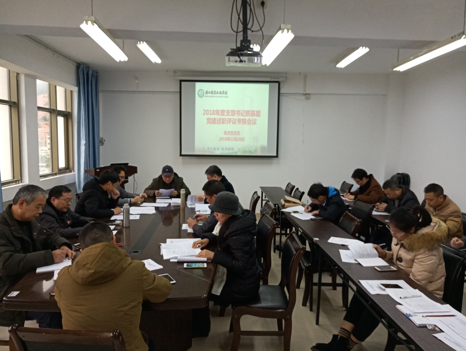 2018年12月28日上午,学院机关党总支在行政楼五楼会议室组织召开2018年度支部书记抓基层党建述职评议会议,会议由机关党总支叶常明书记主持。机关第一、第二支部书记先后就本支部在2018年度党建工作成效、存在问题和不足、整改意见和今后努力方向作述职报告。