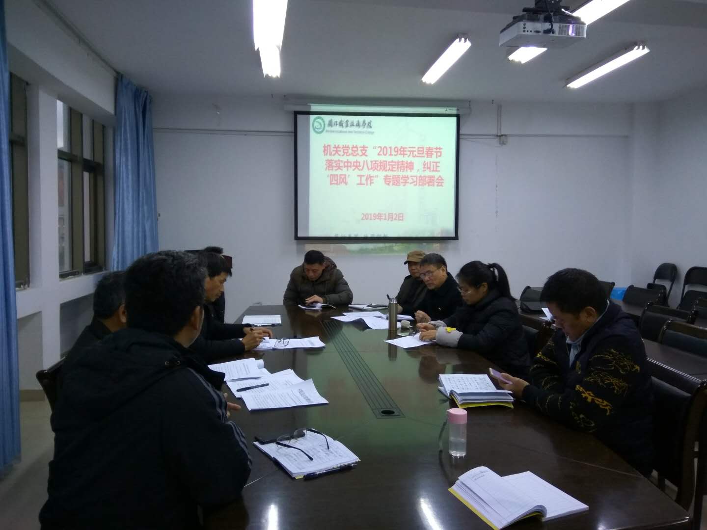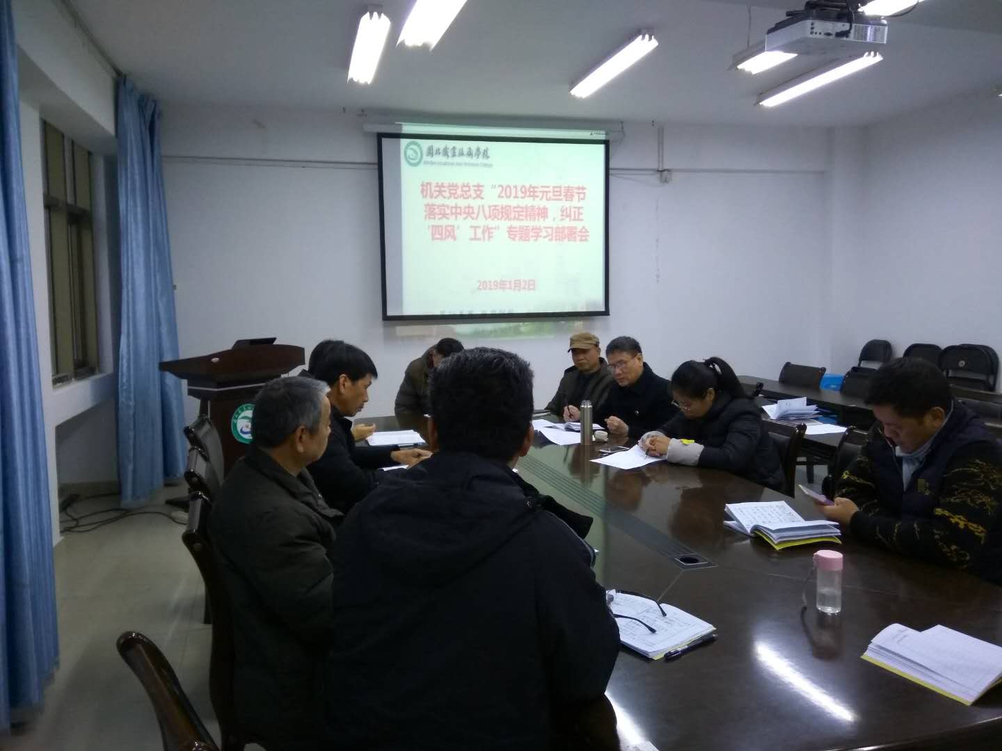 2019年1月2日上午,学院机关党总支在行政楼五楼会议室召开机关全体党员大会,会议由机关党总支叶常明书记主持。学院纪检监察审计处处长、机关党总支委员郑定华同志在会上学习传达了中办、国办和中央纪委“两节”通知文件精神,组织学习了近期中纪委、省纪委、市纪委公开曝光违反中央八项规定精神问题的典型案例通报。与会党员领导干部结合工作实际就如何落实“两节”通知文件精神作讨论发言。