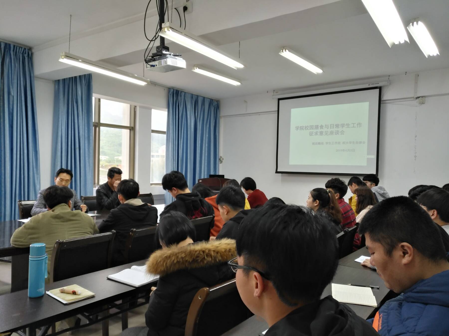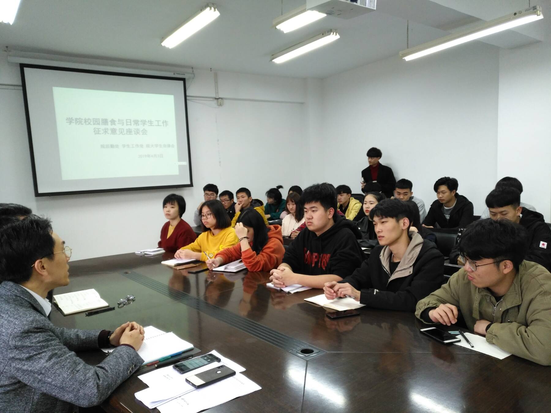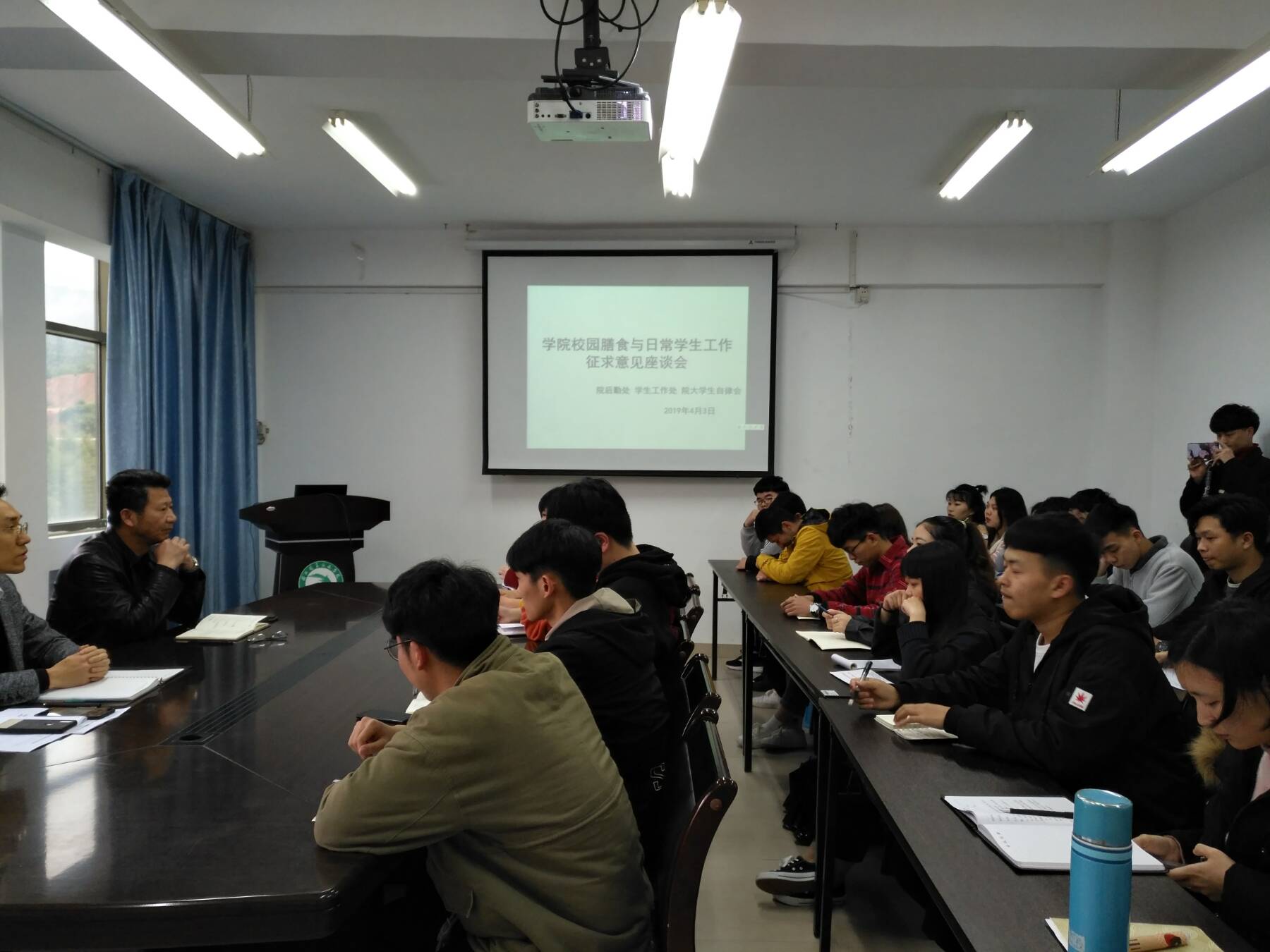 座谈会邀请了来自院大学生自律会、大学生膳食委员会、各系团学干部、基层大学生和一线辅导员等30多位代表,院学工处、院后勤处的负责同志全程听取大家对改善校园餐饮环境、提升服务师生日常工作水平等内容的意见建议。