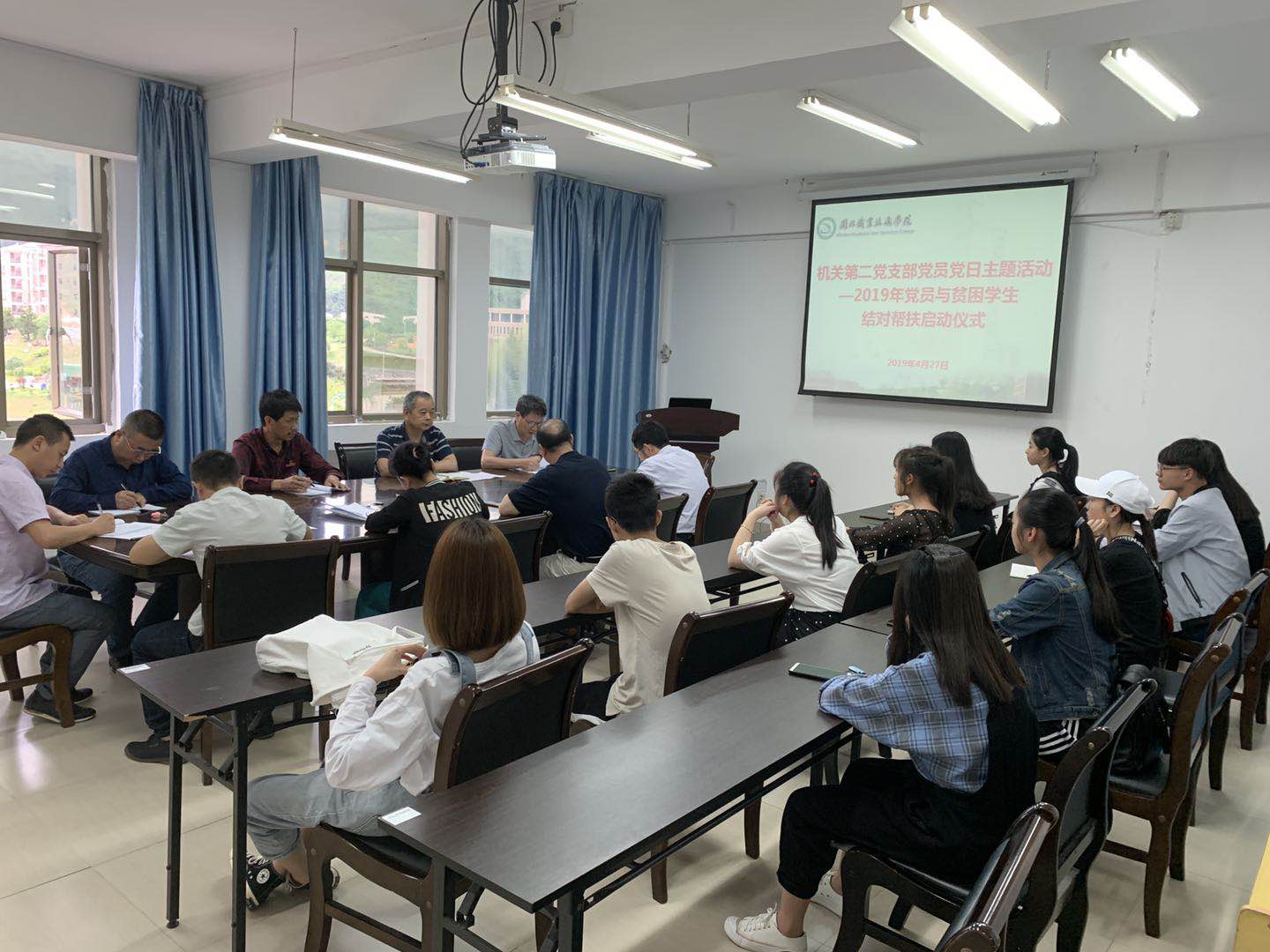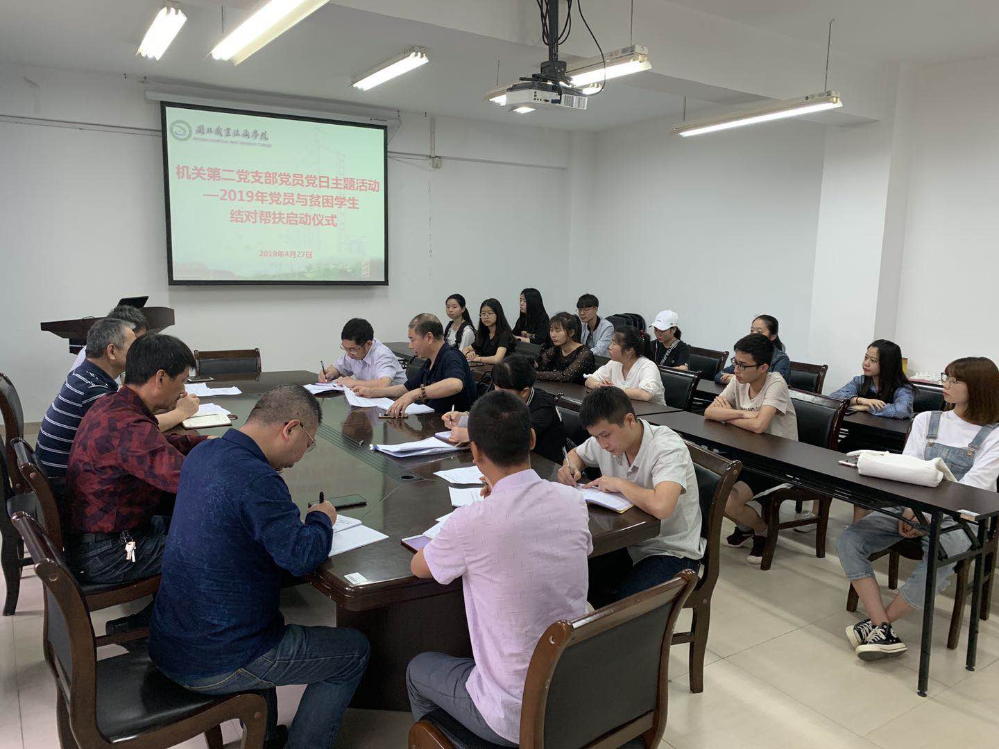 2019年4月27日下午,学院机关第二支部在行政楼五楼会议室,举办2019年机关党员与贫困学生结对帮扶启动仪式。机关第二支部全体党员及结对帮扶学生参加了仪式。