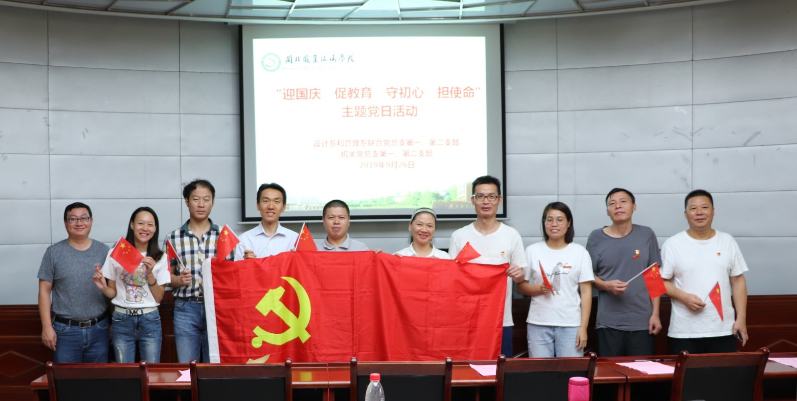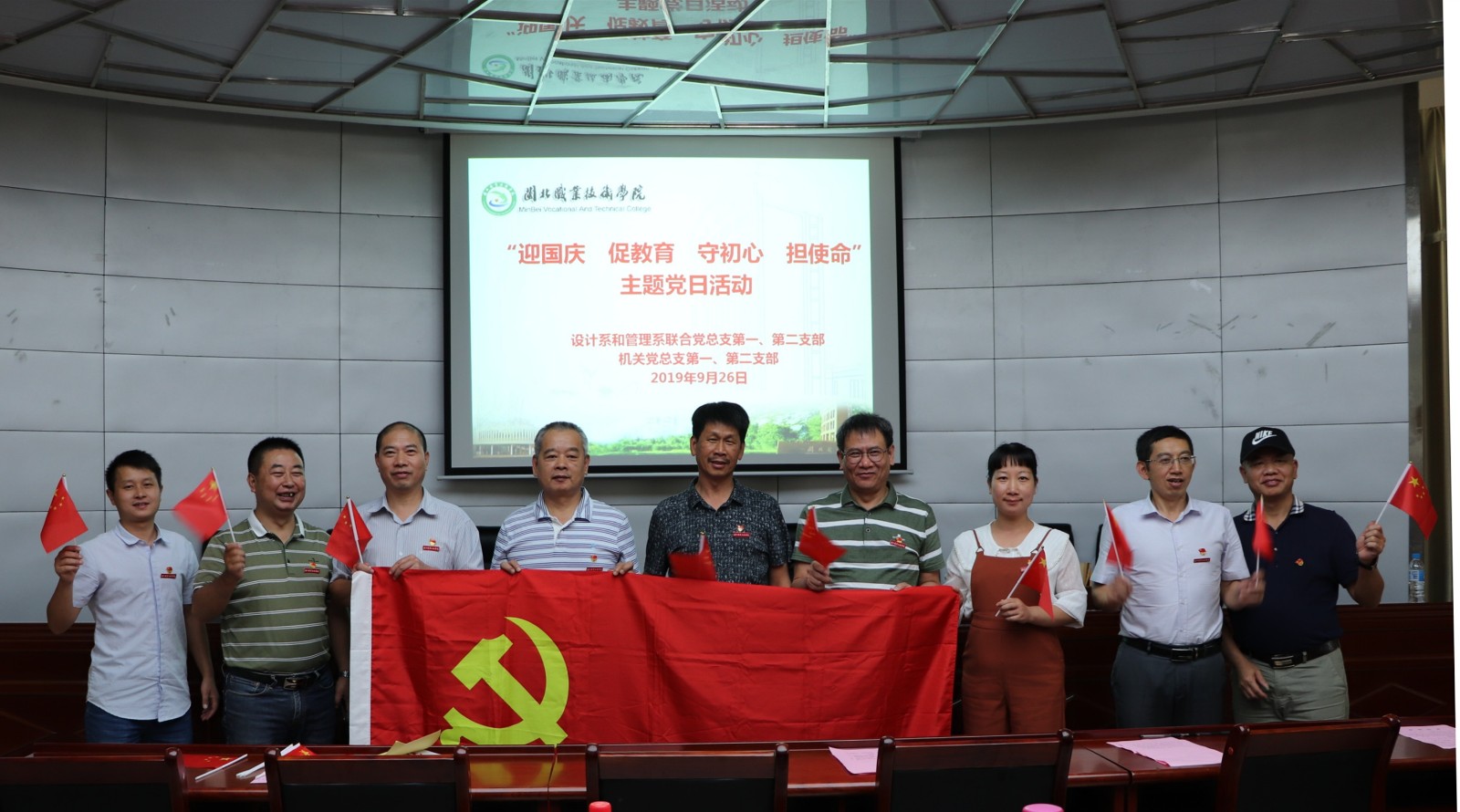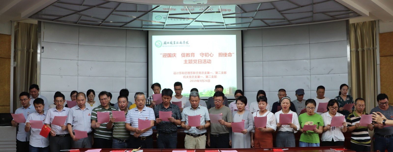 2019年9月26日中午,学院机关党总支组织第一、第二支部全体党员在学院一楼报告厅开展“迎国庆促教育、守初心担使命”主题党日活动。在主题党日活动中,全体党员齐声奏唱国歌、重温入党誓词、全体朗诵方志敏的《可爱的中国》(节选)、合唱《歌唱祖国》,全体党员观看了视频《我们走在大路上》第一集--新中国诞生。机关党员干部普遍认为,在学院开展“不忘初心、牢记使命”主题教育之际,开展主题党日活动,主题鲜明,意义深远。机关党员干部纷纷表示,新时代要更加坚持不忘初心,牢记使命,把党员的先锋形象彰显出来,把党组织的战斗堡垒作用发挥出来,把初心使命体现为党员干部坚定理想信念、锐意开拓进取的精气神和勇于担当作为、主动服务师生的自觉行动,为学院各项事业改革发展贡献力量。
