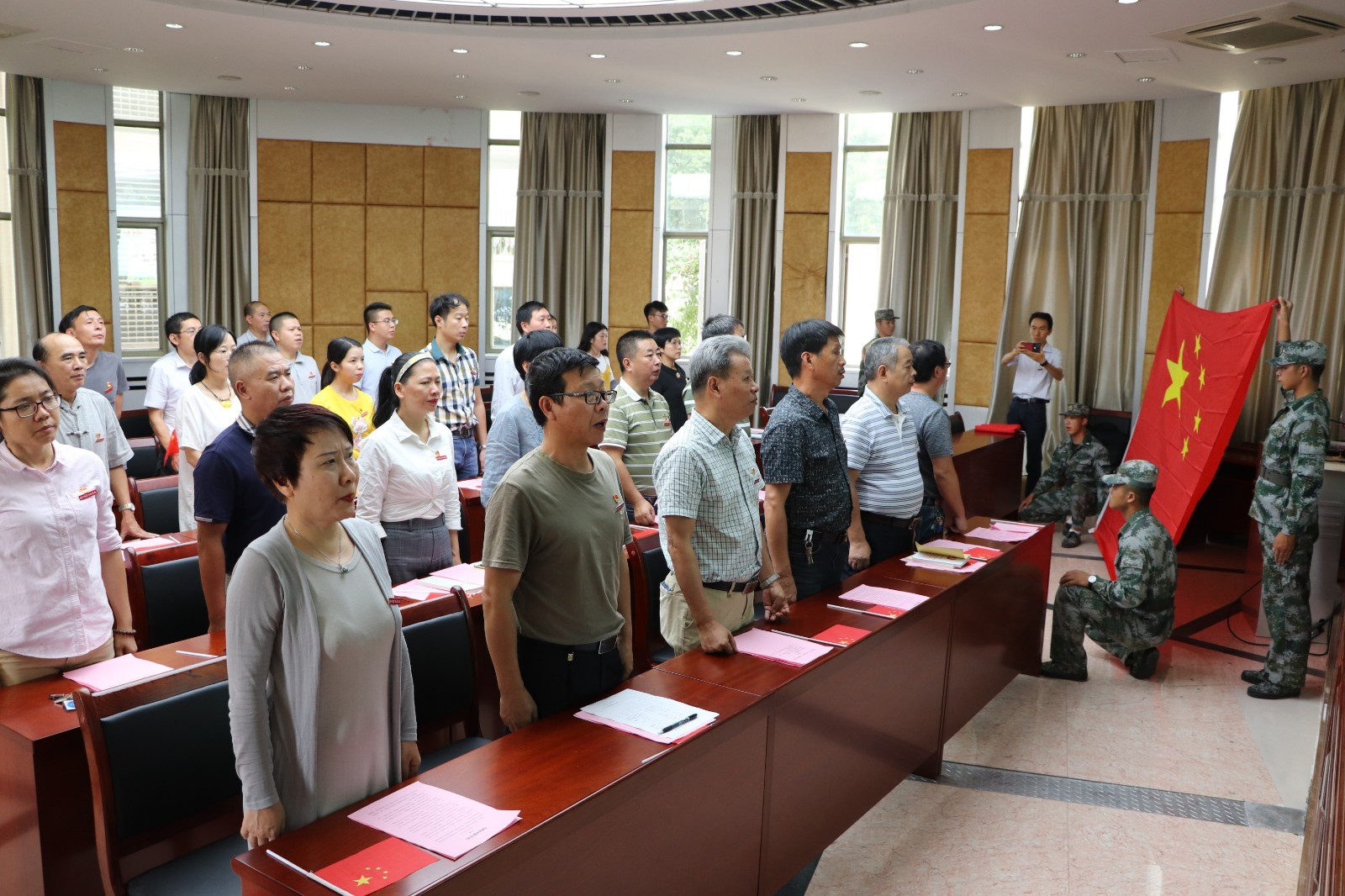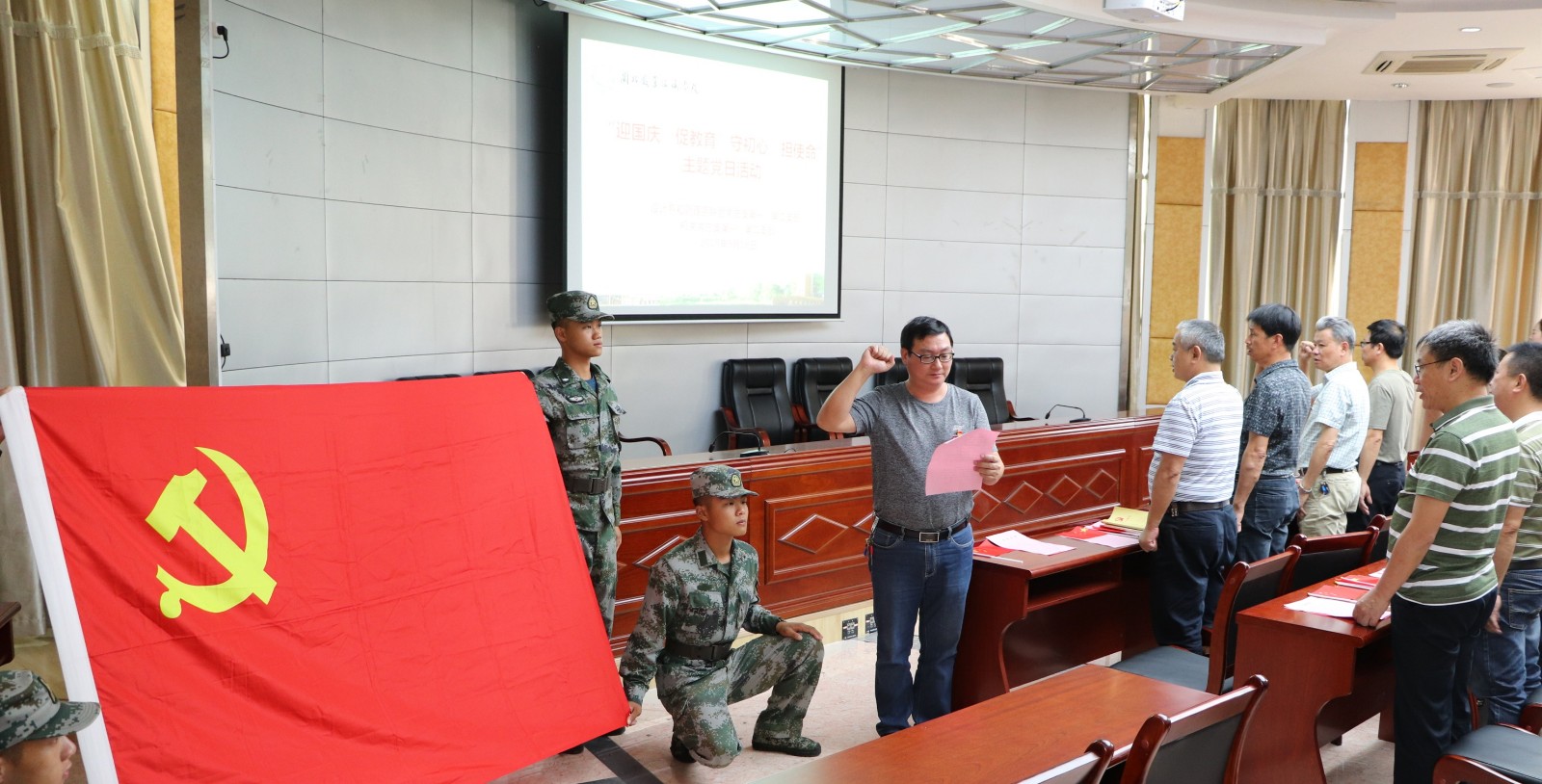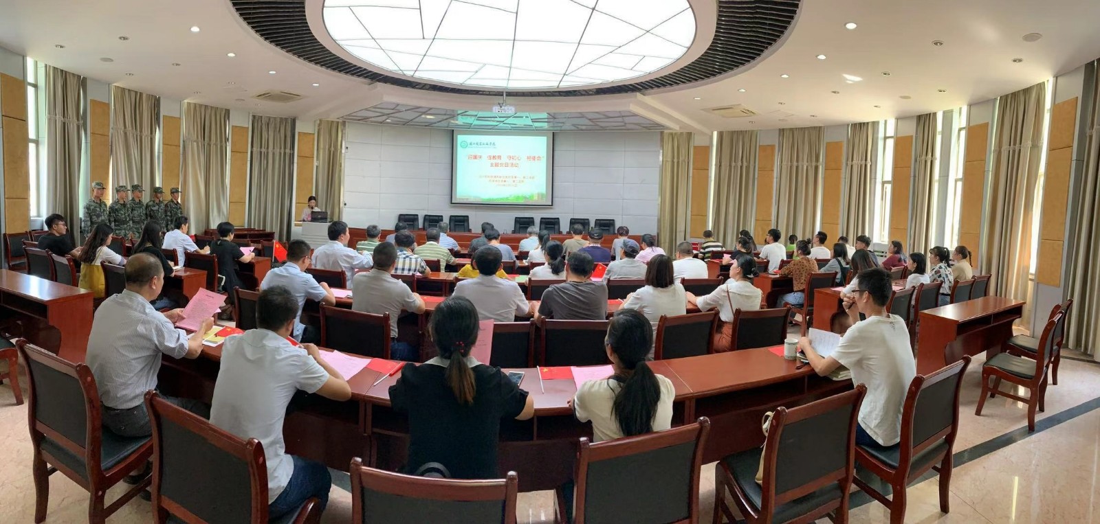2019年9月26日中午,学院机关党总支组织第一、第二支部全体党员在学院一楼报告厅开展“迎国庆促教育、守初心担使命”主题党日活动。在主题党日活动中,全体党员齐声奏唱国歌、重温入党誓词、全体朗诵方志敏的《可爱的中国》(节选)、合唱《歌唱祖国》,全体党员观看了视频《我们走在大路上》第一集--新中国诞生。机关党员干部普遍认为,在学院开展“不忘初心、牢记使命”主题教育之际,开展主题党日活动,主题鲜明,意义深远。机关党员干部纷纷表示,新时代要更加坚持不忘初心,牢记使命,把党员的先锋形象彰显出来,把党组织的战斗堡垒作用发挥出来,把初心使命体现为党员干部坚定理想信念、锐意开拓进取的精气神和勇于担当作为、主动服务师生的自觉行动,为学院各项事业改革发展贡献力量。