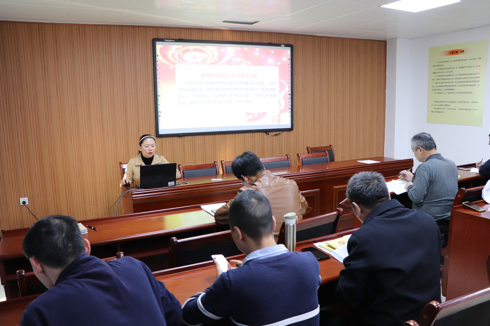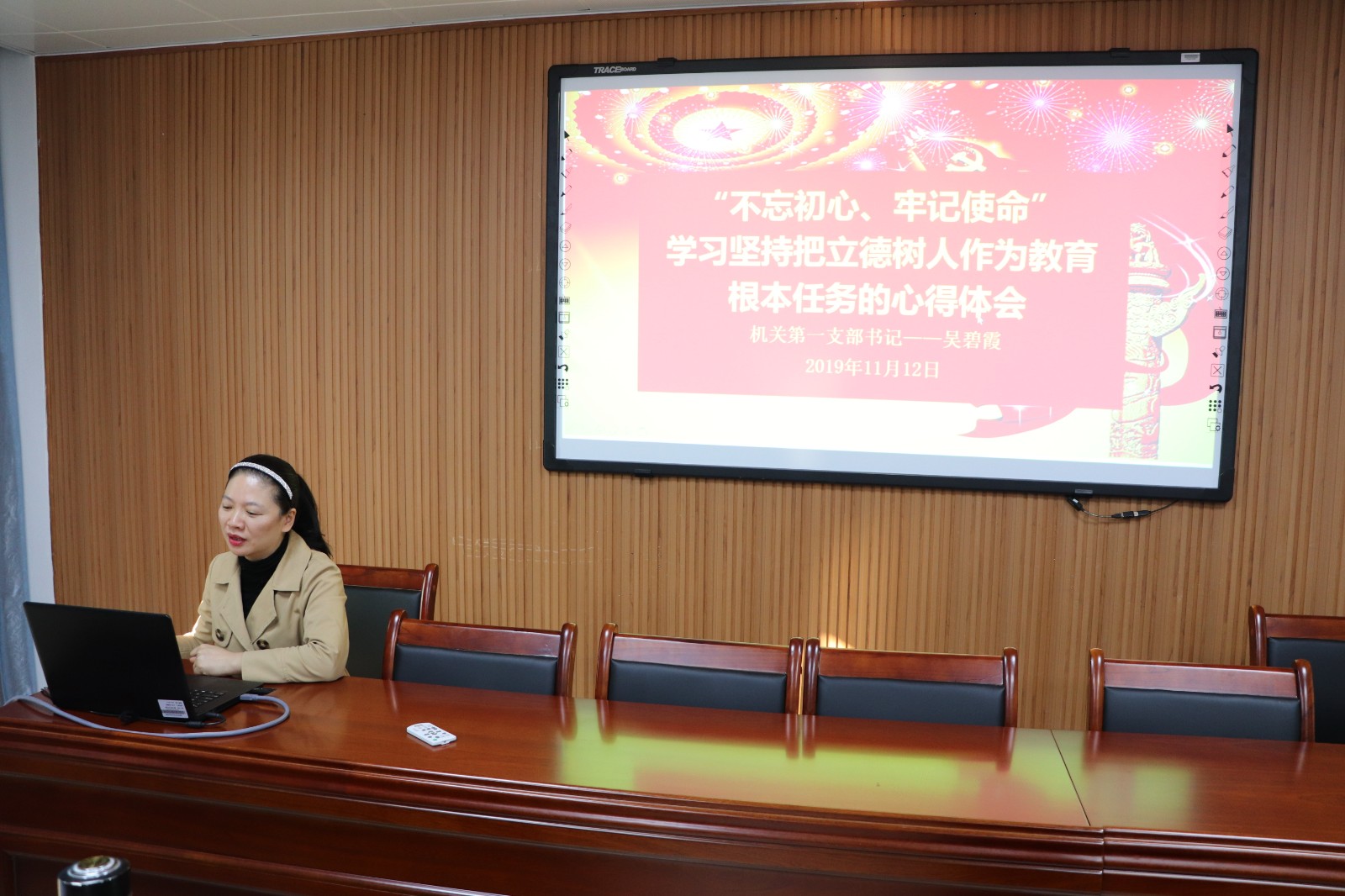 机关第一支部书记吴碧霞作《“不忘初心、牢记使命”学习坚持把立德树人作为教育根本任务的心得体会》报告,她从坚持用习近平新时代中国特色社会主义思想铸就社会主义建设接班人、积极推进思想政治理论课改革创新、努力推动课程思政的切实实施、建设高素质的思政教育师资队伍等内容与大家作学习心得交流。