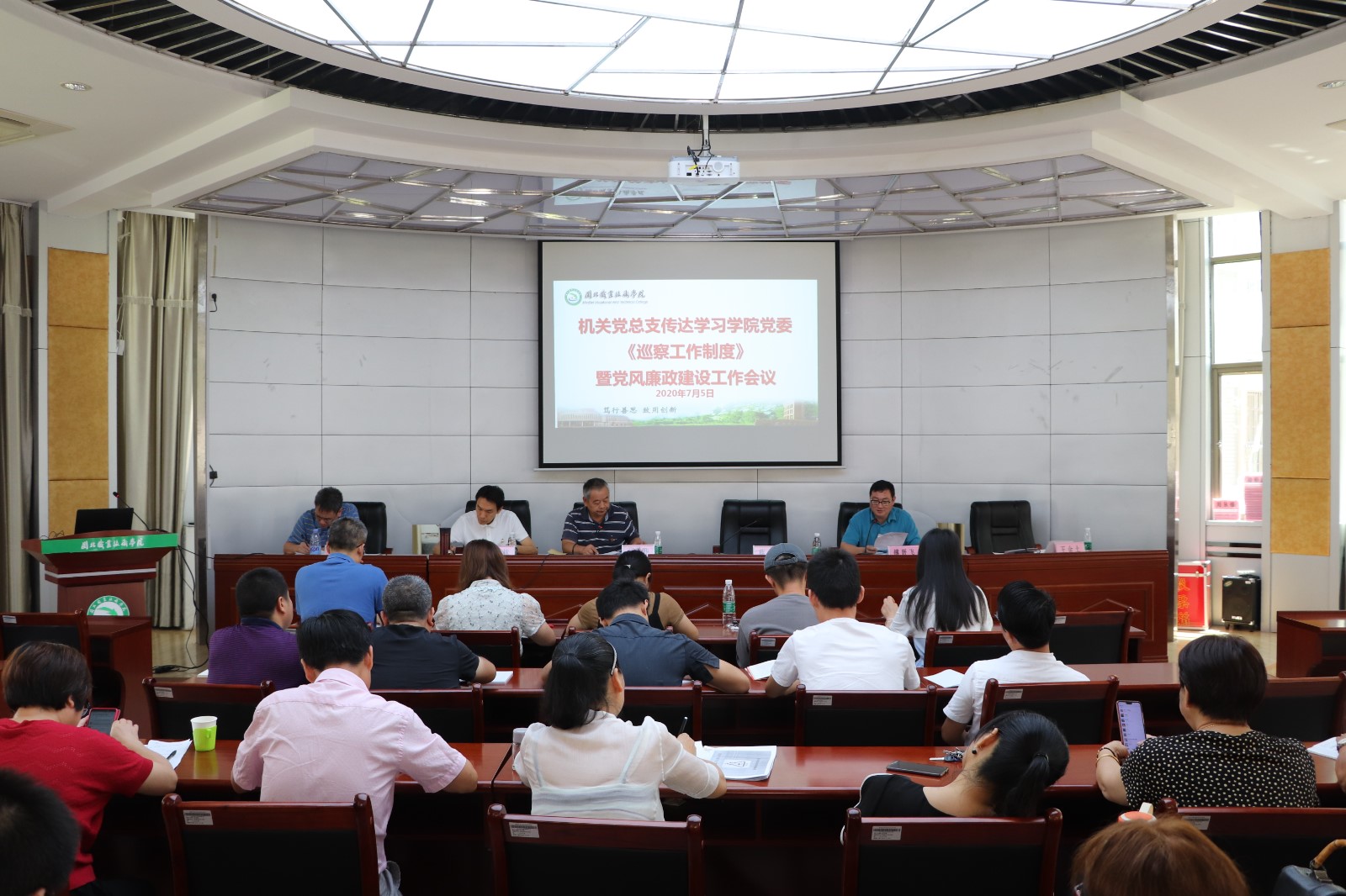 第三阶段:机关党总支纪检委员、学院纪检监察审计处郑定华处长传达学习《中共Beat365中文官方网站委员会巡察工作制度(试行)》,并就有关条款进行了解释说明;会上,还针对教职工身边形式主义和官僚主义、结合使用微信、开办网店等对学院机关各处室党风廉政建设工作提出了具体要求。