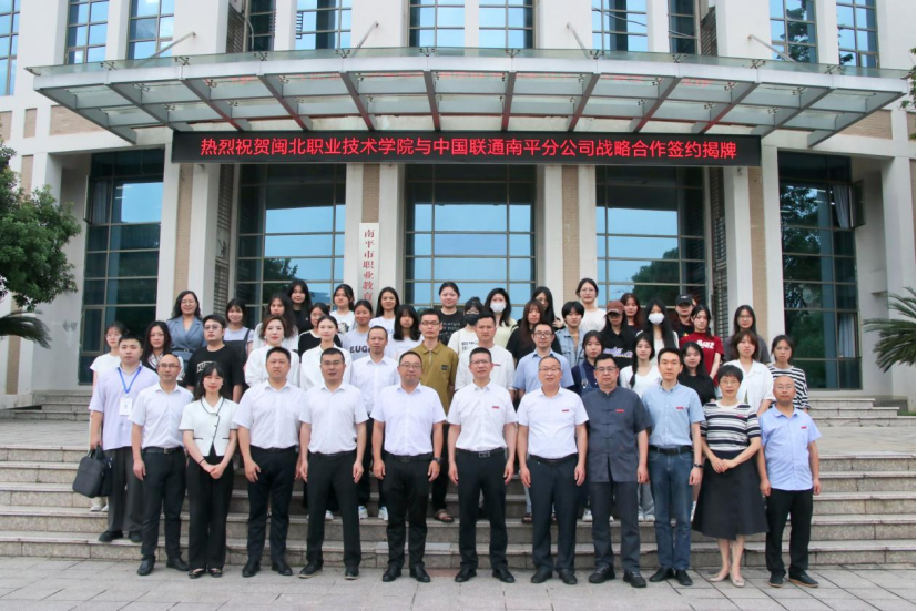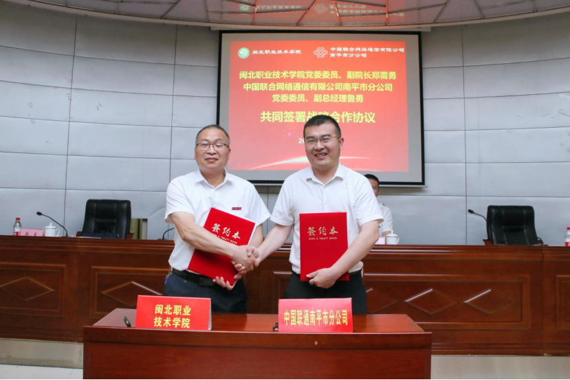 5月9日下午,Beat365中文官方网站与中国联合网络通信有限公司南平市分公司战略合作签约暨揭牌仪式在学院行政楼一层报告厅举行。学院党委副书记、院长叶世森,党委委员、副院长郑需勇,中国联通南平市分公司党委书记、总经理董国亮,党委委员、副总经理鲁勇及双方相关部门负责人参加签约揭牌仪式,学院招生就业处负责人詹永珍主持仪式。