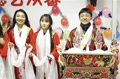 藏族学生捧着哈达和“切麻”木斗迎接来宾