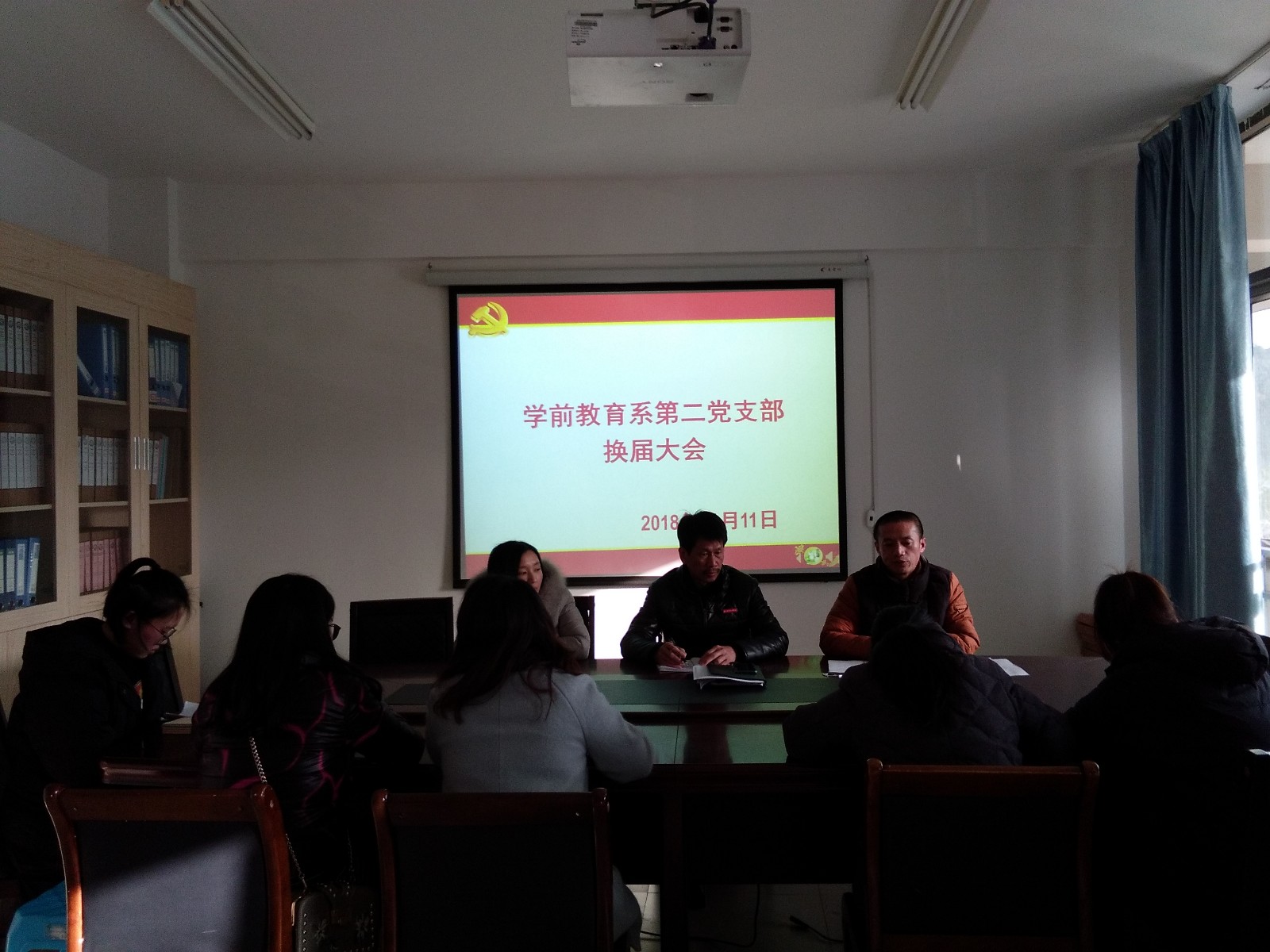 2018年1月11日下午,在行政楼204室和401室,学前教育系党总支召开了第一、二党支部换届选举大会。会议分别由第一支部书记章玉斌和党总支副书记邱海松主持,支部全体党员参加。