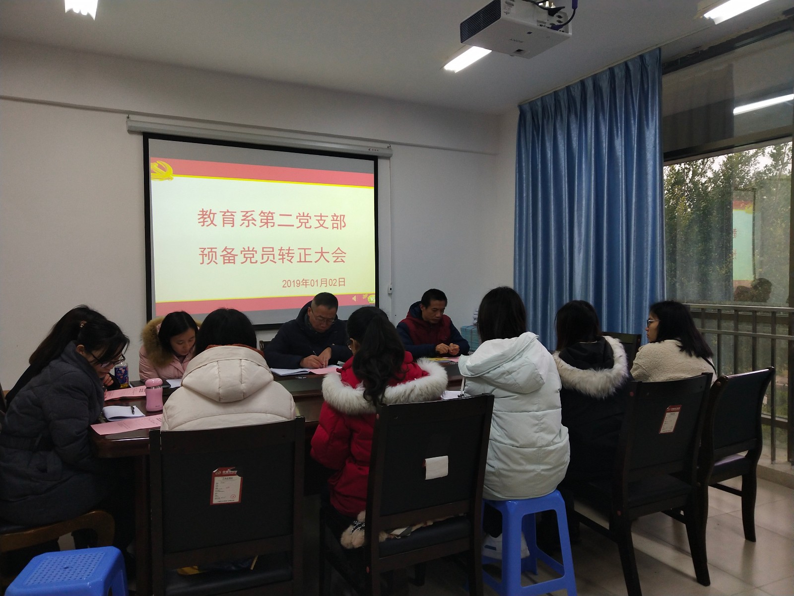2019年1月2日,教育系第二党支部在行政楼204室会议室召开预备党员转正大会。参加此次会议的有教育系第二支部正式党员、预备党员,会议由支部书记张灵暄同志主持。