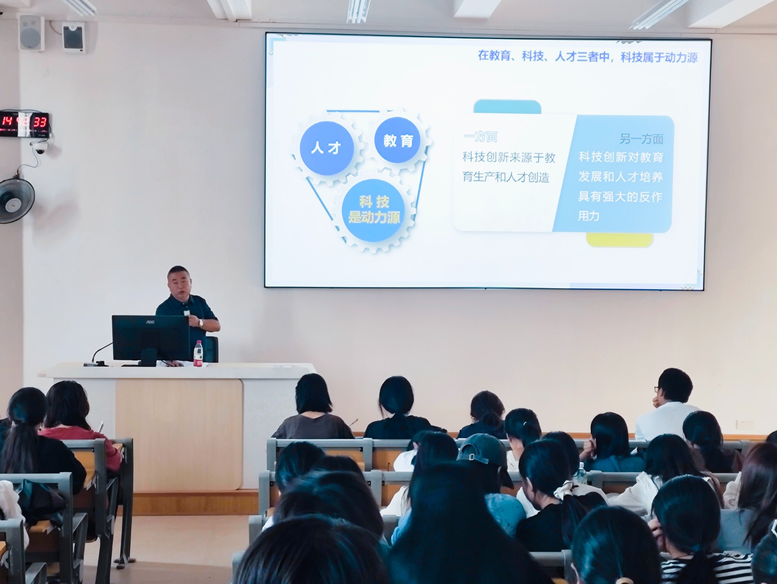 李清龙以《加快建设教育、科技、人才强国》为题,系统阐述了党的二十大报告将教育、科技、人才进行的“三位一体”统筹安排和一体部署,论述了在新时代背景下,教育、科技和人才三者的辩证关系。他指出,作为青年大学生,同学们更应该明晰人才教育的重要性,坚定自身理想信念,树立家国情怀,强化自我学习能力。