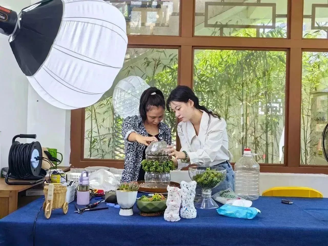随后,队员们还结合所学专业,协助当地主播开展多肉文创品的制作和推广,以直播带货的形式开展公益助农。