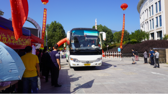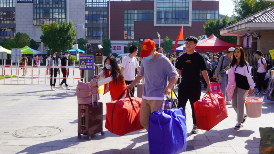 校门口迎新点,老师、志愿者和校车都在等候到达的新同学们,通过测体温、查看健康码之后,由学生志愿者帮忙搬运行李上车,到校内宿舍楼进行报道。
