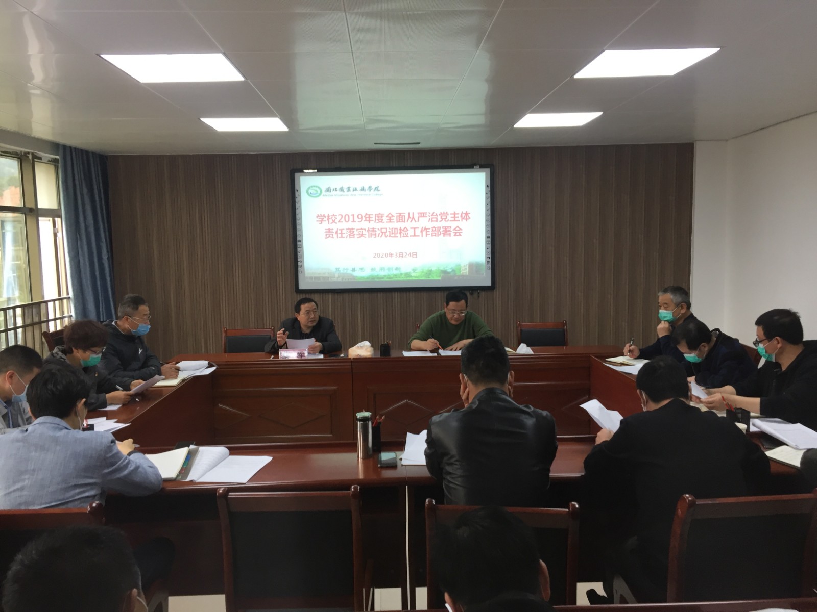 3月24日上午,Beat365召开2019年度全面从严治党主体责任落实情况迎检工作部署会议,院纪委委员,各党总支、系部、处室负责人参加了会议。