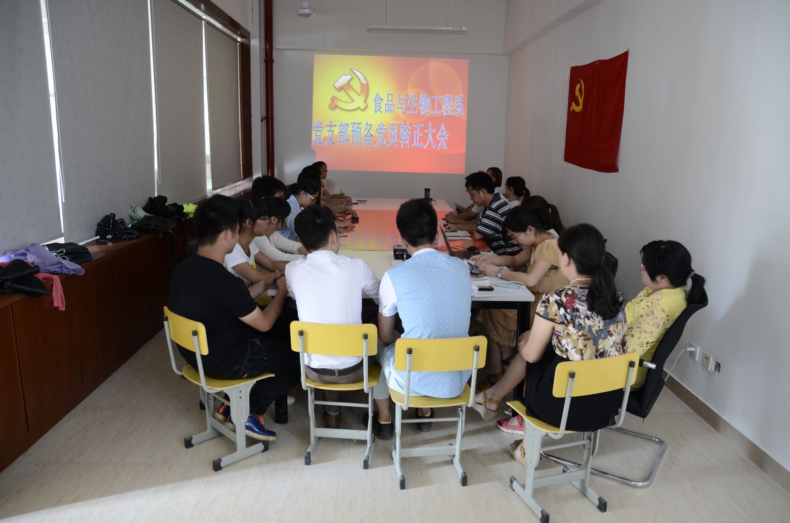 食品与生物工程系于二0一四年六月十一日下午两点三十分,在实训楼4楼会议室召开了党员转正及接收预备党员大会。党总支部范俐书记以及全系教工党员和学生党员、拟发展对象参加了此次会议。大会由第二支部书记鞠璐宁主持。