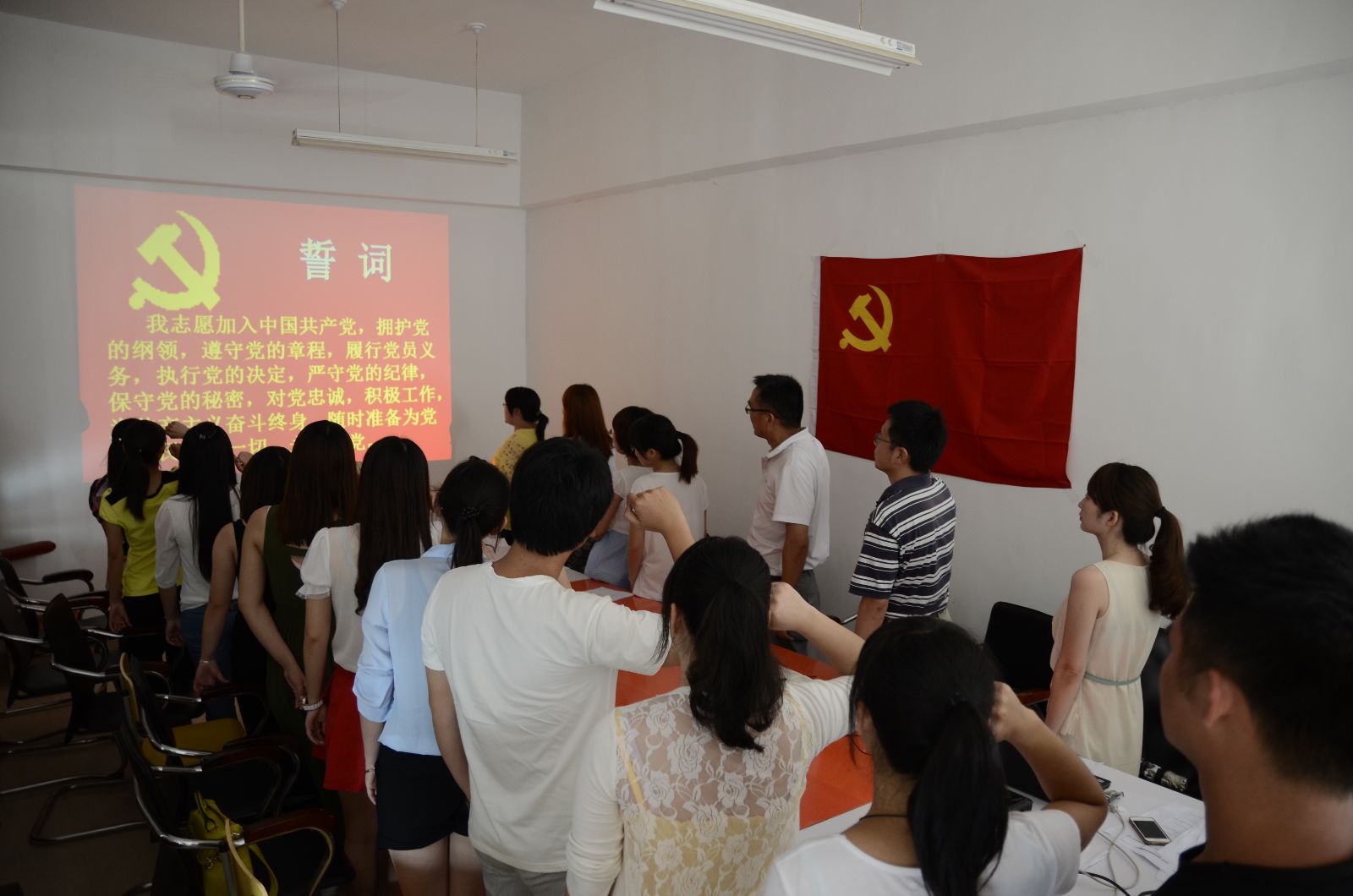 第二项会议议程会议按照接收预备党员大会的程序,首先由发展对象分别宣读了《入党志愿书》,汇报自己对党的认识、入党动机、本人履历及需要向党组织说明的问题。然后由入党介绍人对其推荐的发展对象进行了全面评价,并对其能否入党表明意见。最后,大会通过举手表决一致通过了危功衡、马祖汉、郑雅红等11位发展对象加入中国共产党,并进行了入党宣誓。