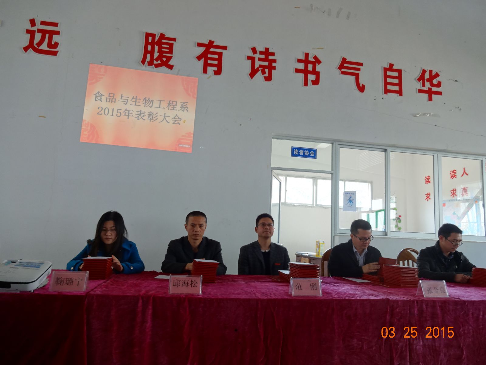 为表彰在2013-2014学年中品学兼优、各方面表现优秀的先进同学,2015年3月25日下午,我系在图书馆阅览厅召开了2013-2014学年校级“三好”学生、优秀学生干部、先进班集体和校级奖学金表彰颁奖大会,院长助理、院招生与继续教育处副处长、系党总支常务副书记范俐,系主任、系党总支副书记张金良,系党总支委员、学生科科长邱海松,信息与工程系教学科研办公室副主任黄华,食品与生物工程系教学科研办公室副主任鞠璐宁出席了大会,系辅导员、各班班主任及全系在校生参加了大会,会议由系辅导员张灵暄主持。大会上共表彰了三好学生3名,优秀学生干部6名,奖学金25名,先进班集体1个。