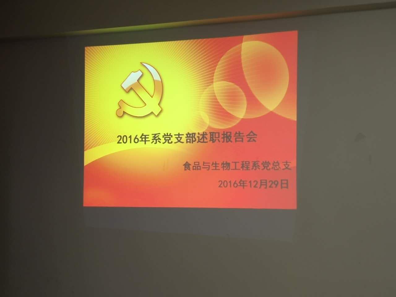 2016年12月29日上午,食品与生物工程系党支部述职报告会在办公楼407会议室举行,系第一党支部书记鞠璐宁同志及第二党支部书记黄妍同志分别代表各自支部向系党总支作了2016年党建工作及党风廉政建设工作方面的述职,系党总支郑启阶同志、张金良同志等参加了述职评议会。