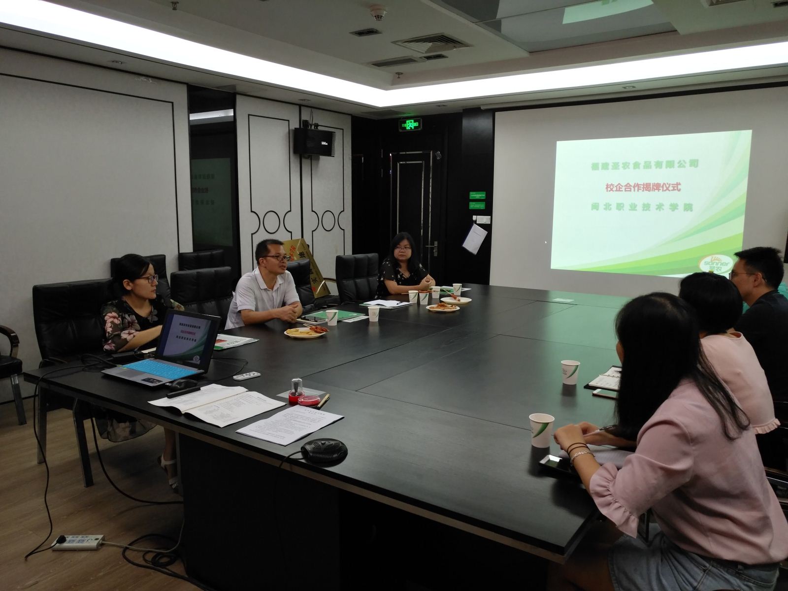 为拓展我系学生的校外实训,进一步深化校企合作,开辟学生毕业就业市场,2017年8月25日,食品与生物工程系郑启阶、鞠璐宁、黄妍等部分教师在系主任张金良的带领下,来到了福建圣农食品有限公司福州办事处洽谈校企合作事宜。双方就校企合作的有关事项进行了充分磋商,最后达成了一致意见签署合作协议,同时举行了隆重的揭牌仪式。