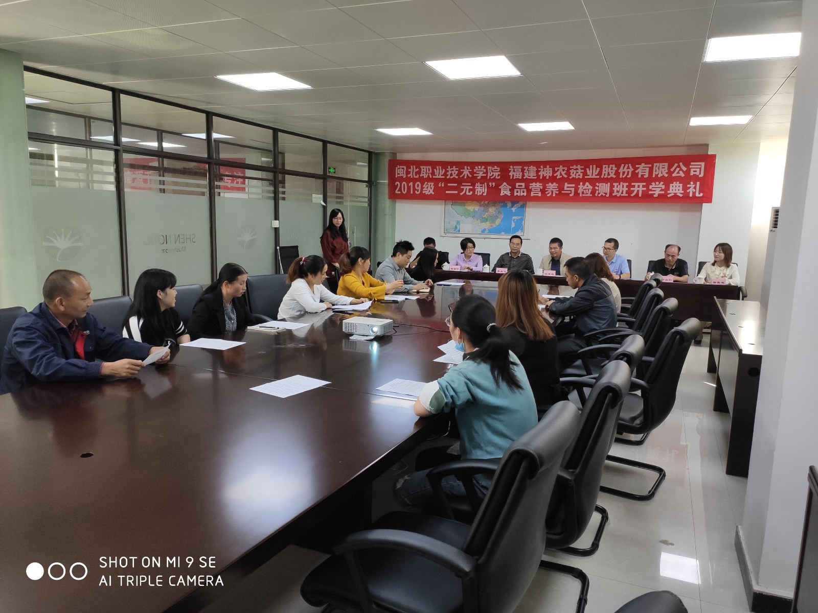 10月22日下午,我系携手校企合作企业福建省神农菇业股份有限公司隆重举行2019级“二元制”食品营养与检测班开学典礼。活动在神农菇业公司举行,我系党政领导、顺昌县科技局领导、神农菇业公司领导及“二元制”班级全体学生参加了典礼。