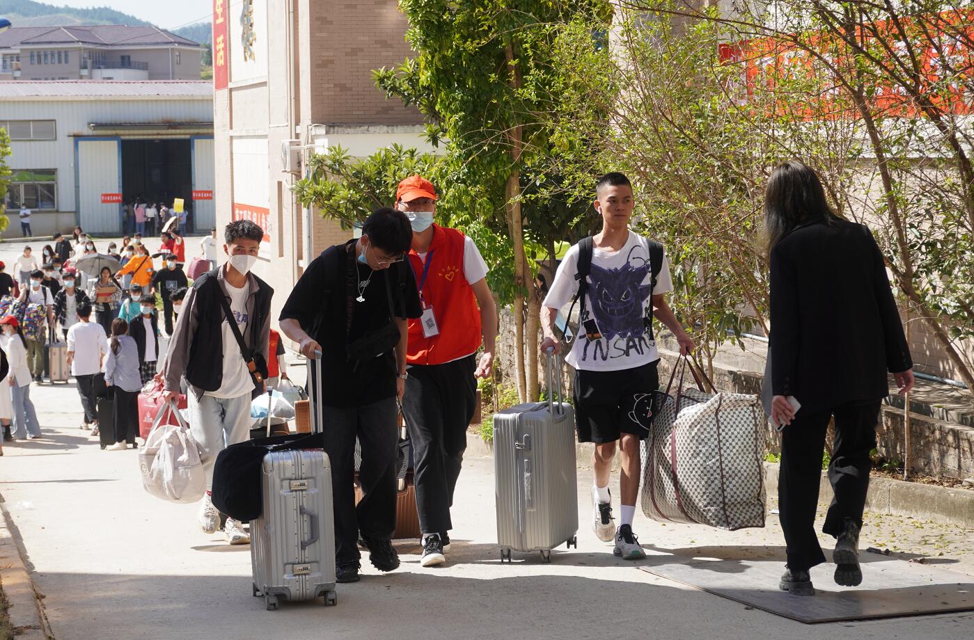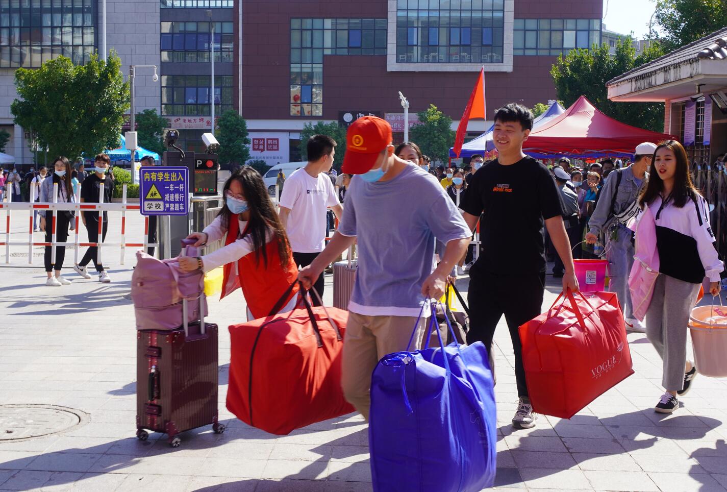 男生宿舍、女生宿舍,房门次第打开,“小红帽”志愿者喘着粗气小心地把新生行李码放整齐,转身准备迎接下一个新同学,只留下行李上依稀可见的爱心手印。