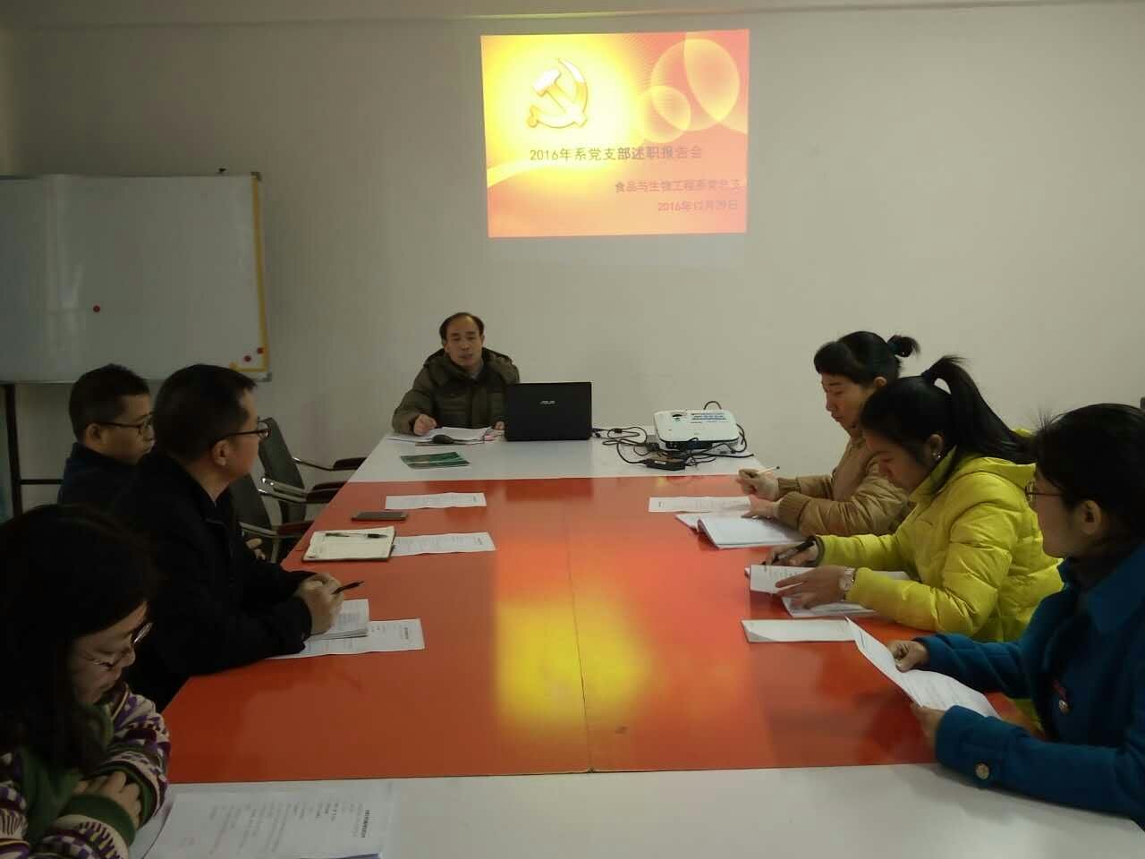 2016年12月29日上午,食品与生物工程系党支部述职报告会在办公楼407会议室举行,系第一党支部书记鞠璐宁同志及第二党支部书记黄妍同志分别代表各自支部向系党总支作了2016年党建工作及党风廉政建设工作方面的述职,系党总支郑启阶同志、张金良同志等参加了述职评议会。