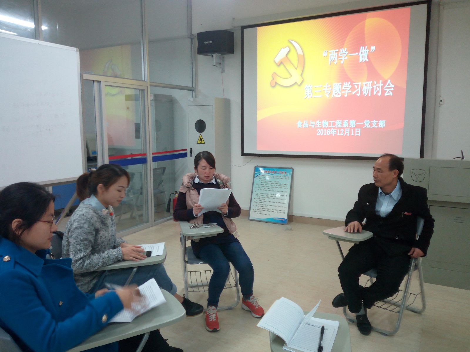 2016年12月1日下午,食品与工程系第一党支部召开了“两学一做”学习教育第三专题集中学习研讨会。会上部分党员汇报了各自的学习心得,大家互动交流,重点学习研讨了十八届六中全会精神、省第十次党代会精神、南平市第五次党代会精神、《关于新形势下党内政治生活的若干准则》及《中国共产党党内监督条例》等,学习研讨会在热烈的气氛中圆满结束。