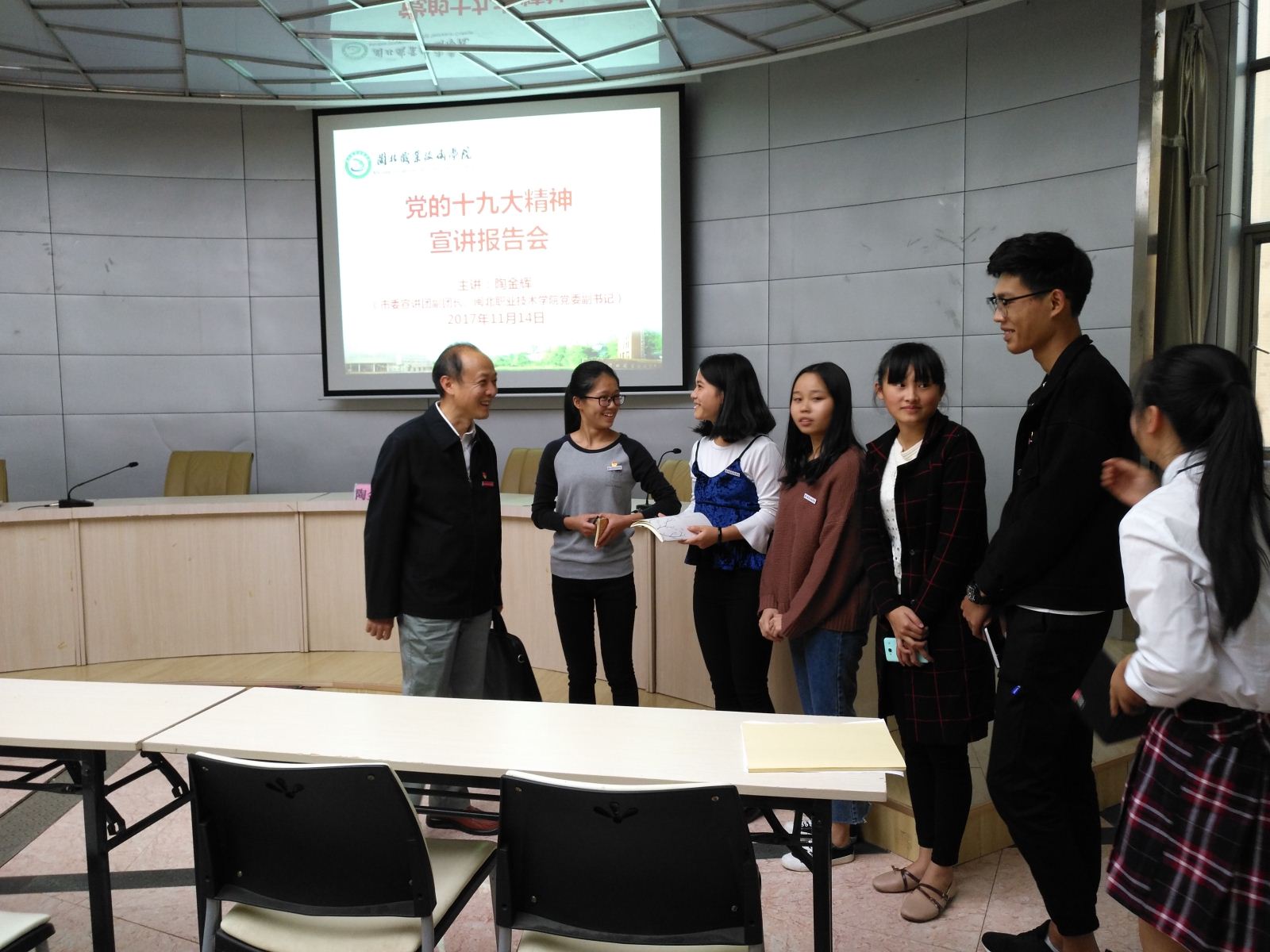 2017年11月14日下午,Beat365党的十九大精神宣讲报告会在行政办公楼一楼报告厅举行,南平市市委宣讲团副团长、院党委副书记陶金辉同志作了宣讲报告,院中层以上党员干部、各总支委员、支部委员、学生代表等70余人参加了报告会,我系领导主任、总支副书记张金良,系常务副书记郑启阶等出席了会议。陶副书记从“关于十九大的主题、成果”、“关于习近平新时代中国特色社会主义思想”等八个方面进行了宣讲。宣讲全面、到位,切合实际,全体与会人员对党的十九大精神有了更深入的认识。报告会结束后,陶副书记现场接受了学生的采访,对学生提出的问题进行了一一解答。