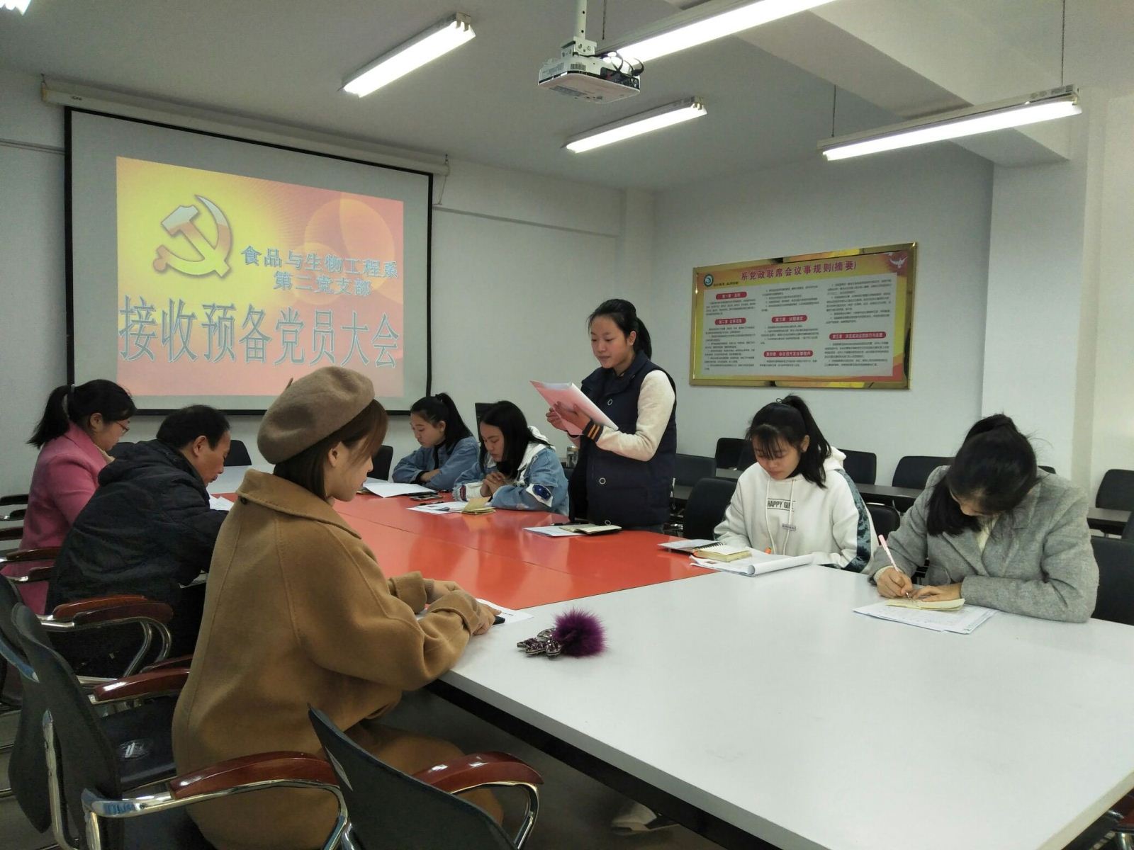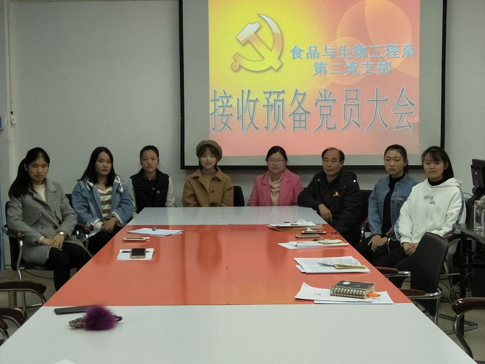 食品与生物工程系第二党支部于二0一八年一月二日下午两点三十分,在行政楼407会议室举行了接收预备党员支部大会。党总支部郑启阶书记以及食品与生物工程系第二党支部全体党员、发展对象参加了此次会议。会议主要讨论了是否接受廖红珍、李 虹、曾小芸、曾巧艺等4位同志为中共预备党员的问题,大会由食品与生物工程系第二党支部黄妍书记主持。