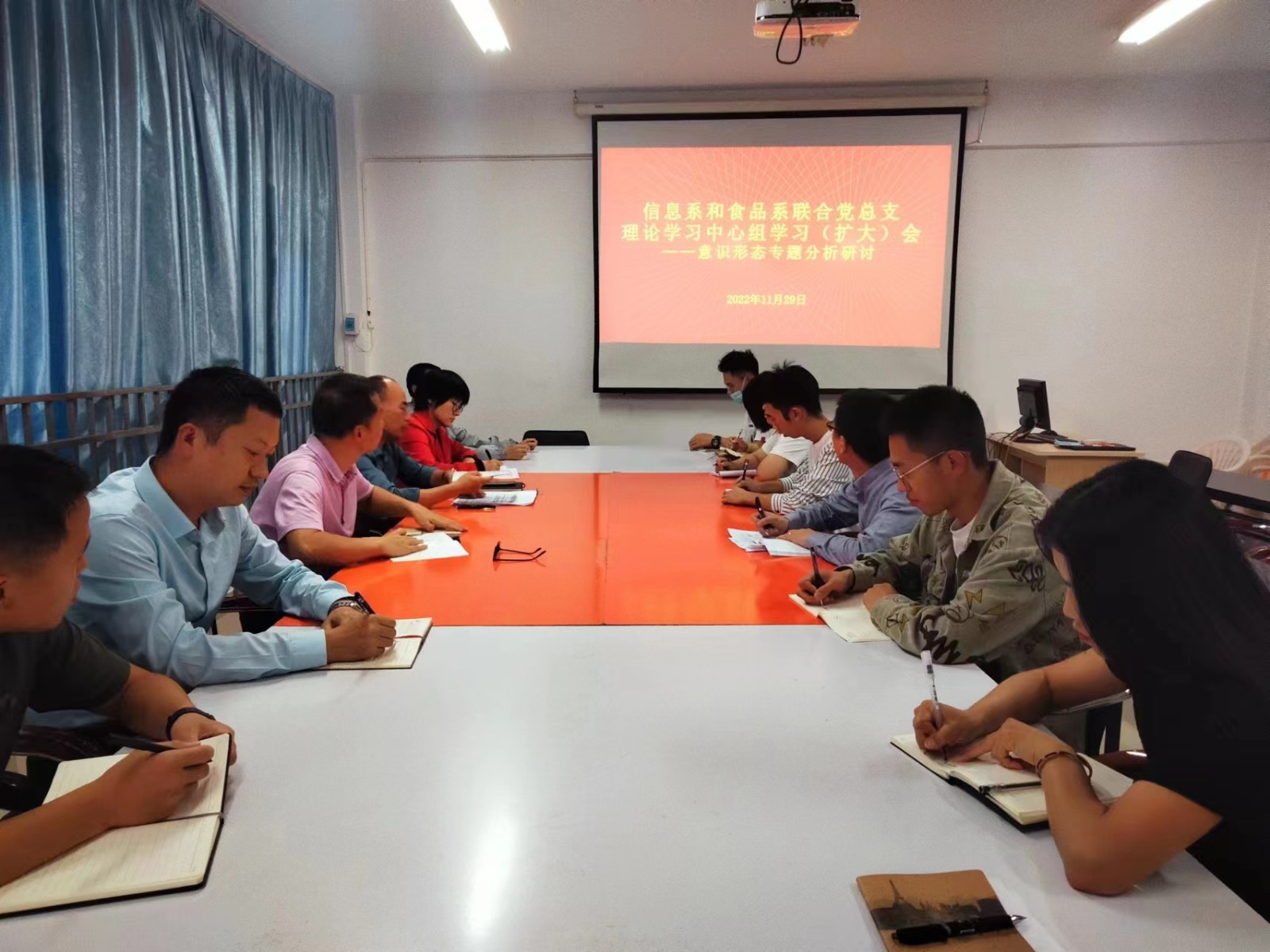 11月29日下午,信息系和食品系联合党总支在行政楼407会议室召开了理论学习中心组学习会(扩大)暨意识形态专题分析研讨会议。会议由系党总支书记郑启阶主持,中心组成员及学生科全体辅导员参加了会议。