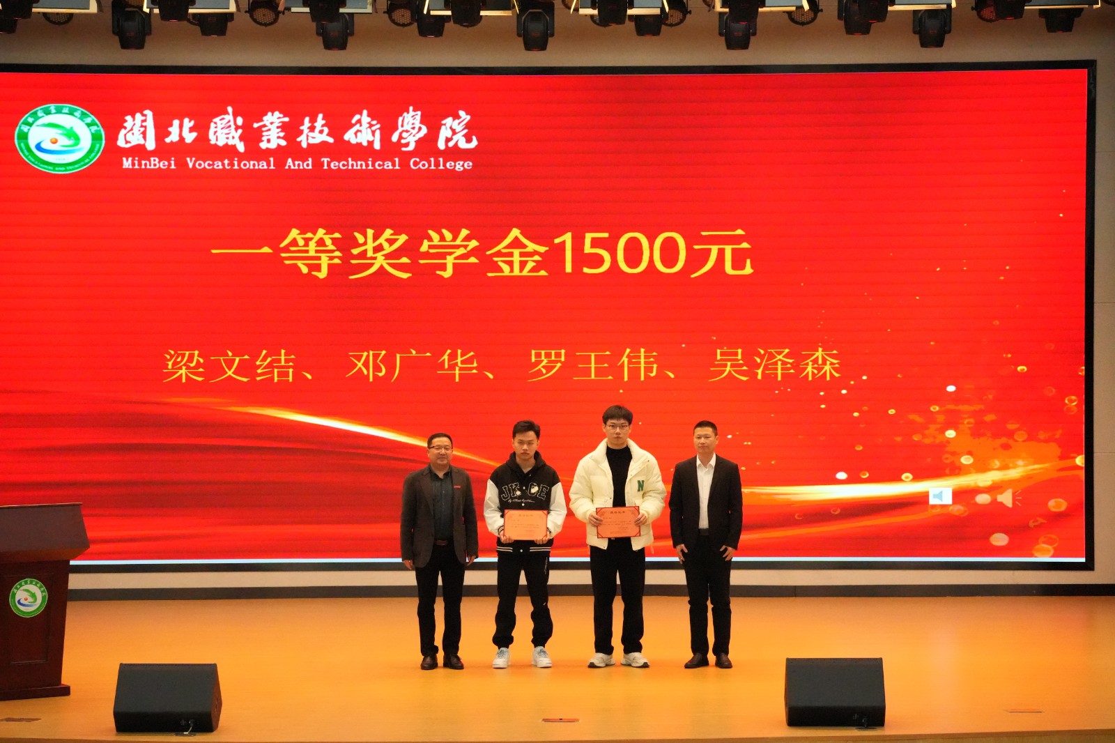 校企双方共同为获奖学生颁奖,共颁发一等奖学金4名、二等奖学金8名、三等奖学金12名。