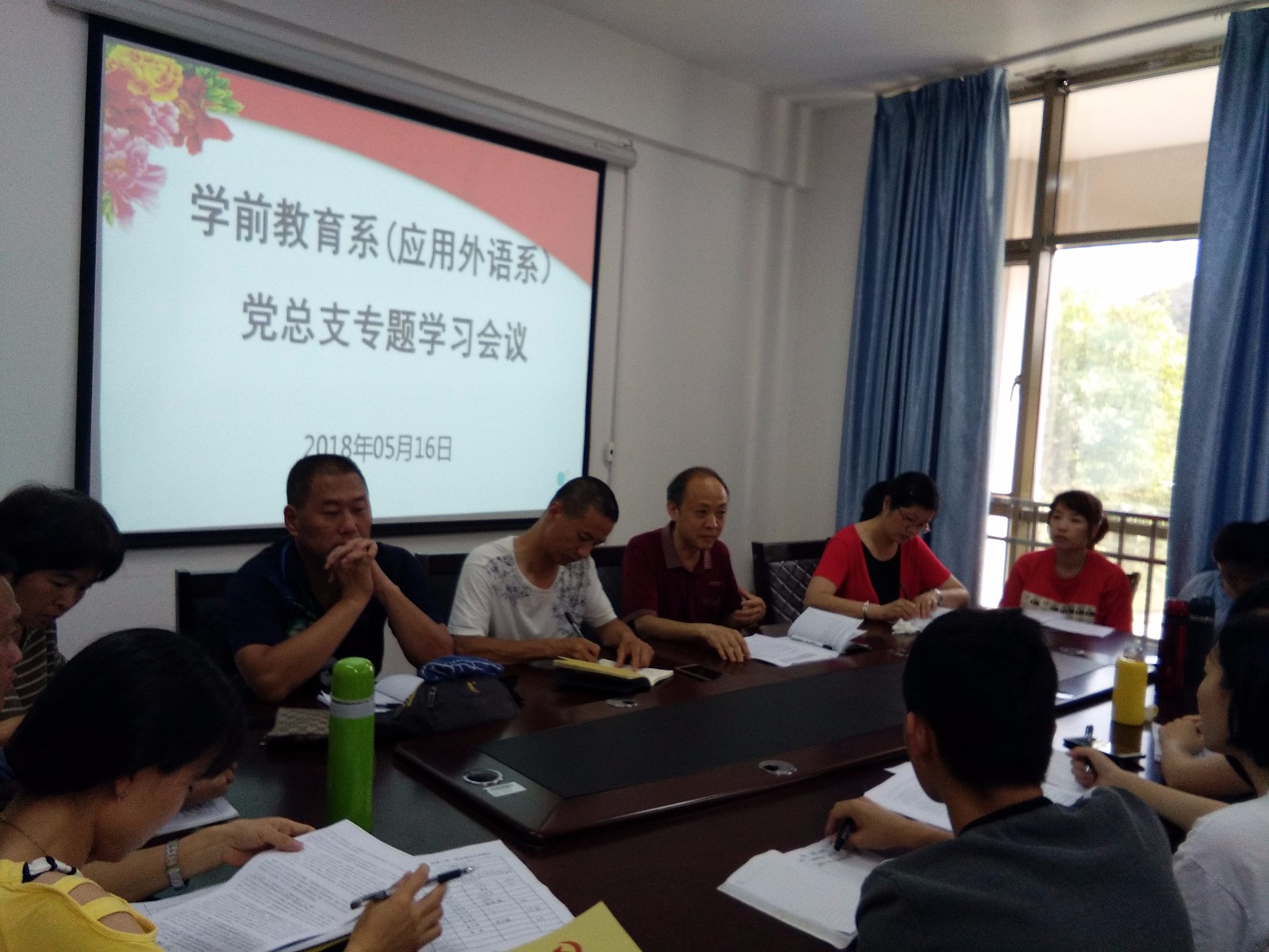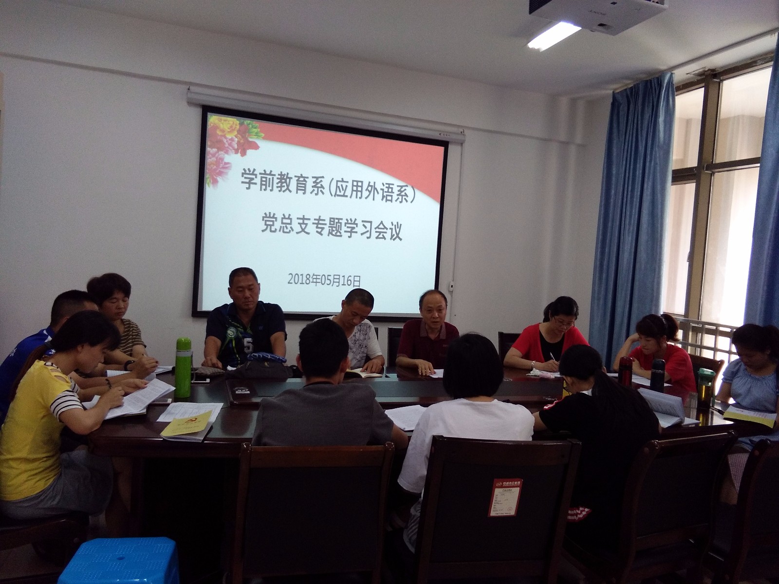 2018年5月16日下午14:30,学前教育系(应用外语系)党总支在行政楼204会议室召开“三会一课”专题学习会议。会议由学前教育系党总支副书记邱海松同志主持,全体党员参会。会上,郑桂芳同志带领全体党员一起学习了“习近平总书记在纪念马克思诞辰200周年大会上的重要讲话”精神;各支部代表在会上交流了学习心得。学院党委陶金辉副书记代表第三支部在交流会上作了发言。最后,系党总支副书记邱海松要求各支部按照上级党组织规定,做好“三会一课”的学习。