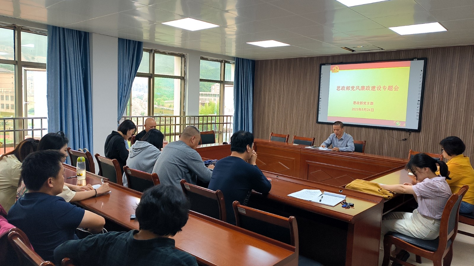 2023年5月24日下午,思政部党支部在行政楼607会议室召开党风廉政建设专题会,会议由思政部党支部书记邱海松同志主持。