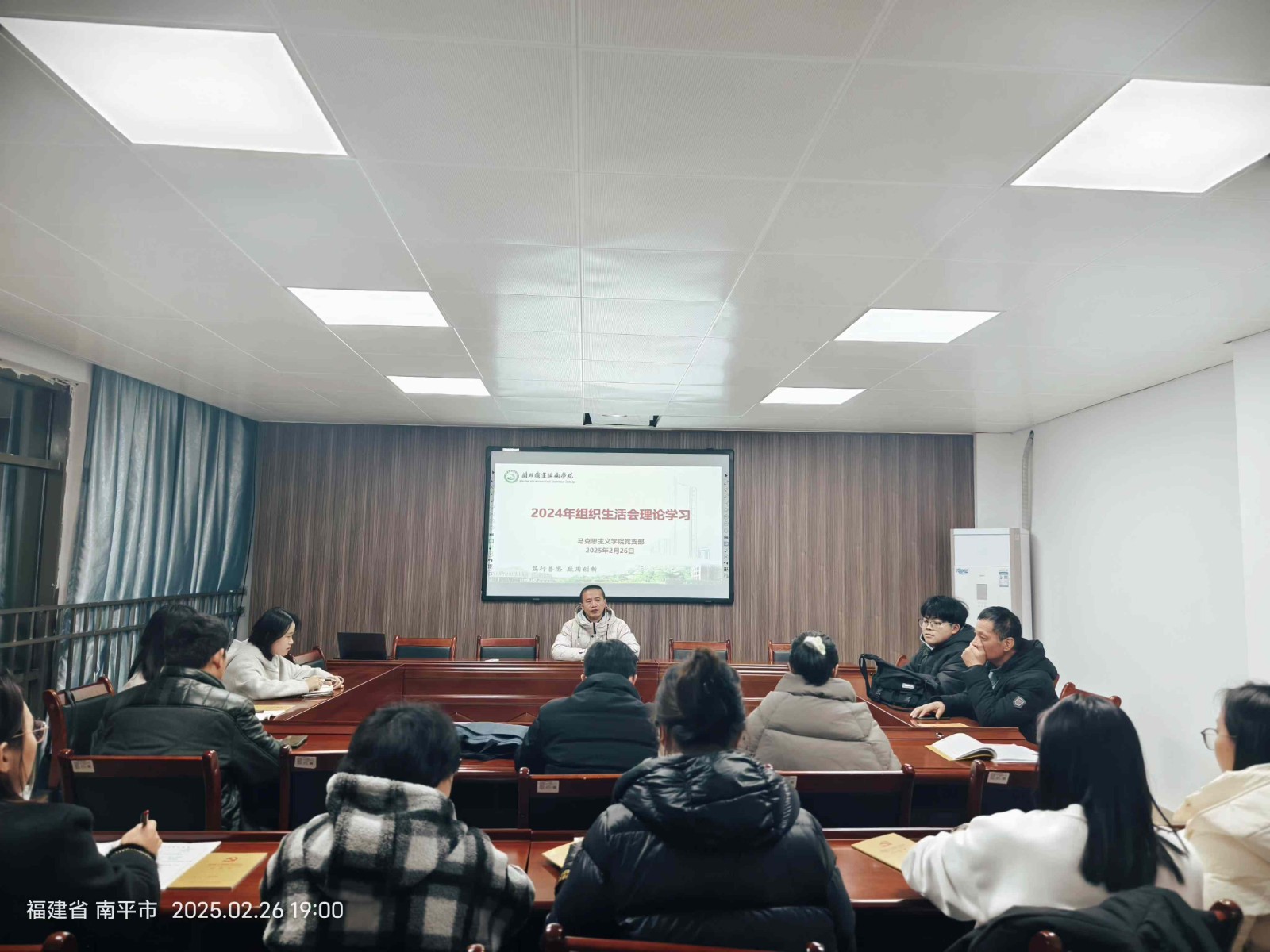 2025年2月26日晚,马克思主义学院党支部在行政楼607会议室召开主题教育专题组织生活会党员学习大会,支部全体党员参加了会议,会议由党支部书记邱海松同志主持。