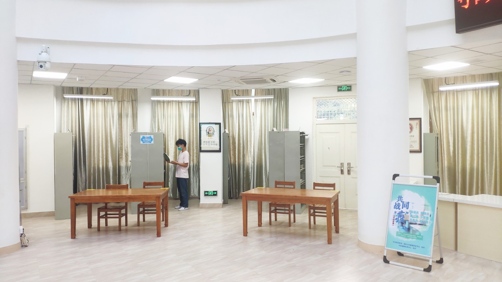 每天上午八点半开馆以后,陆续有佩戴着口罩的读者在工作人员的引导下,秩序井然地从图书馆左侧大门,经过信息登记、体温检测正常后进入图书馆。自习室里,读者们按照“间隔1米、同向而坐”的落座方式,就座在有安全标识的座椅上。前来阅读的小许同学表示:“宿舍不比图书馆有学习氛围,学习效率自然也就没那么高,所以还是喜欢来图书馆。”对于疫情期间图书馆的防控举措,小许同学觉得很到位:“比如限流开馆,比如每日一次的全面消杀,以及佩戴口罩检测体温等,都让人觉得很安全很周到。”