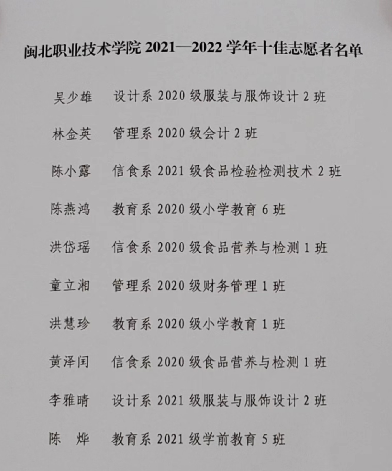 关于表彰2021-2022学年学院共青团先进集体、先进个人的决定(闽北职院团〔2022〕7号)