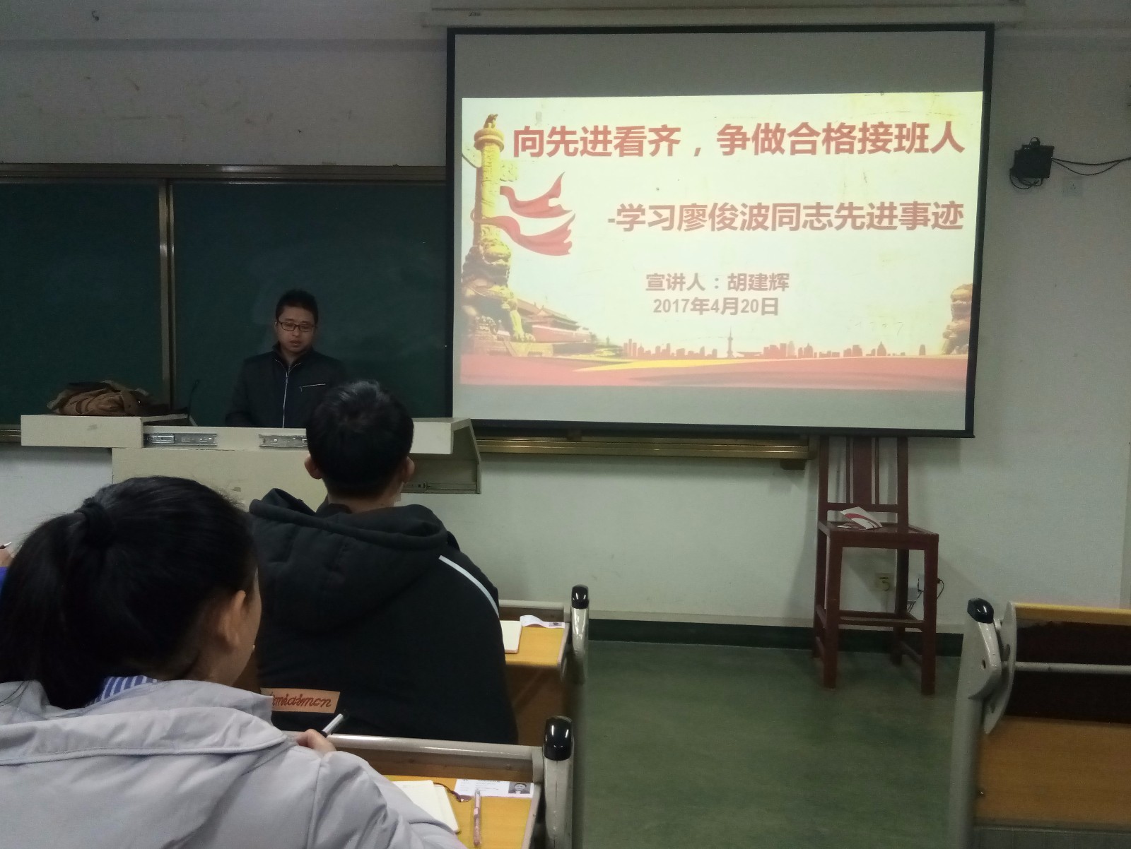 2017年4月20日晚,我系第二支部在教学楼205教室召开学习廖俊波同志先进事迹专题党课,支部书记胡建辉同志以“向先进看齐,争做合格接班人-学习廖俊波同志先进事迹”为题,分别从廖俊波同志的个人简介、优秀品质、先进事迹等方面进行讲解,并号召全体学生向先进看齐,争做合格接班人。通过本次党课学习,大家对廖俊波同志的先进事迹有了深刻的了解,坚定了以廖俊波为镜,不忘初心,扎实工作学习,继续前进的决心。支部党员、入党积极分子、主要学生干部参加了本次党课。