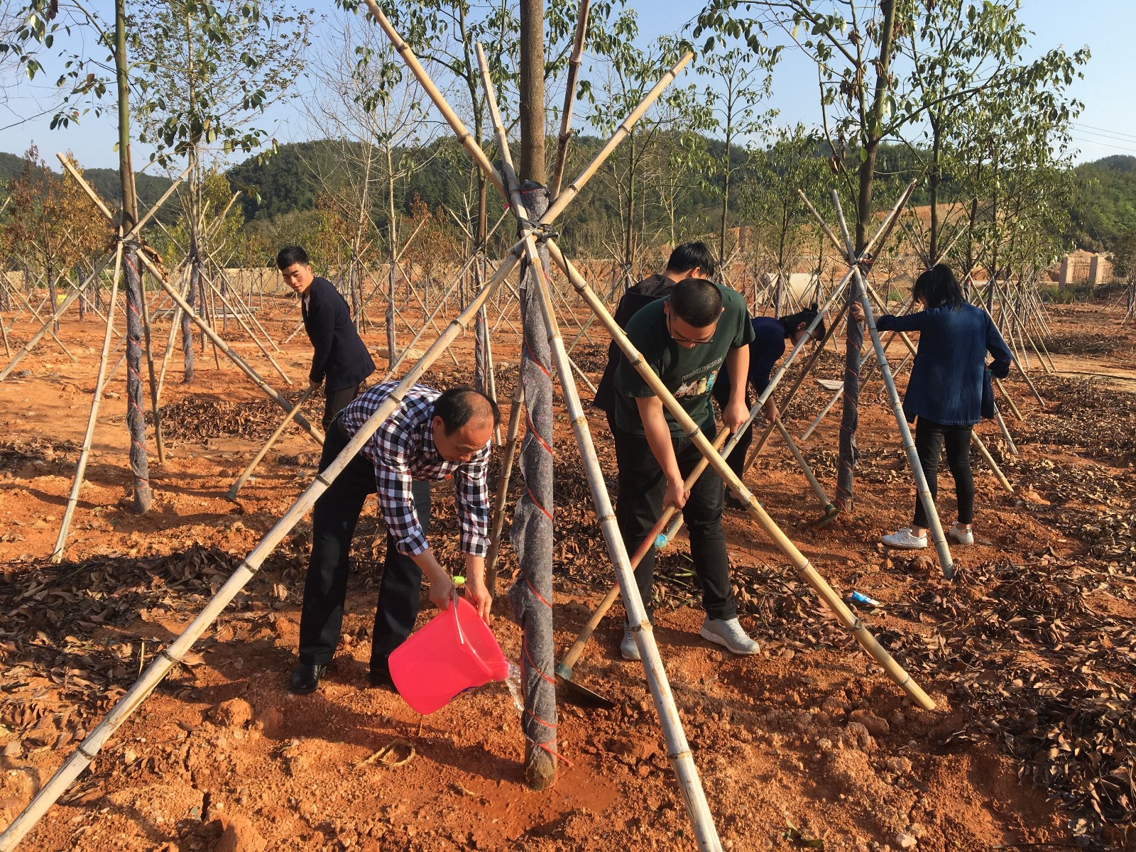 党课结束后,郑启阶书记组织带领全体参会党员和入党积极分子到学院教学楼后为之前3月12日植树节新种的小树苗培土和浇水,让它们能更好的成长。